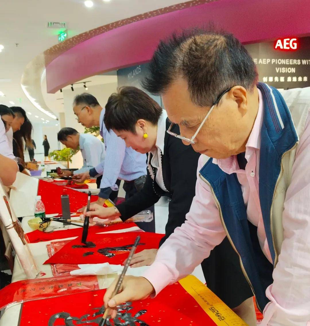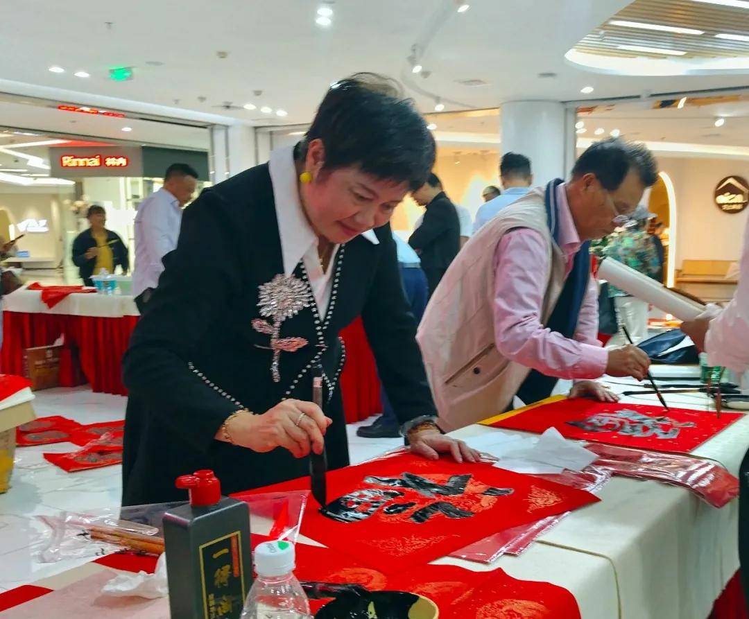 在笔会现场,符诗碧挥毫创作楹联书法作品。并与阮江华主席、羊宏会长等楹联书画家,一起为广大市民和顾客写春联、送福字。