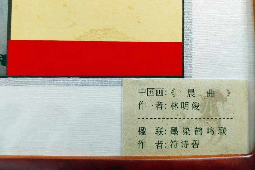 符诗碧撰联并精心创作的行书楹联书法作品《墨染千山翠,鹤鸣万木春》,与中国美术家协会会员、海南省美术家协会副主席、海南大学教授林明俊创作的国画作品《晨曲》,同框装裱展出。