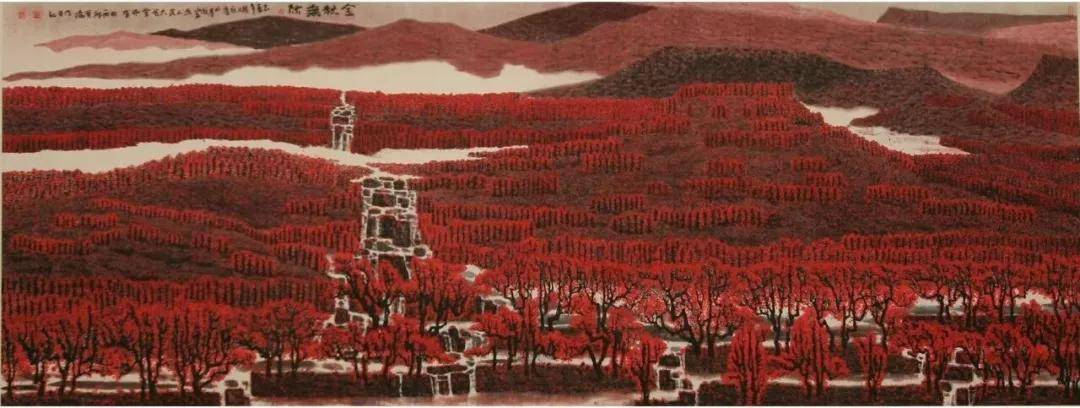 红色调作品堪称“红的壮丽”典范。2006年,他为人民大会堂创作的巨幅山水画《金秋无际》,以香山红叶为题材,用朱砂渲染出层林尽染的壮丽景象,替代了原悬挂的潘天寿作品《松》,成为人民大会堂首次收藏的北京风情题材作品。