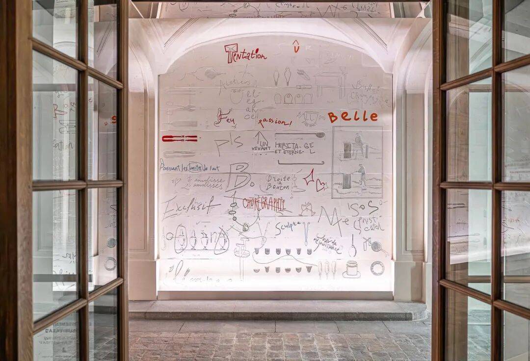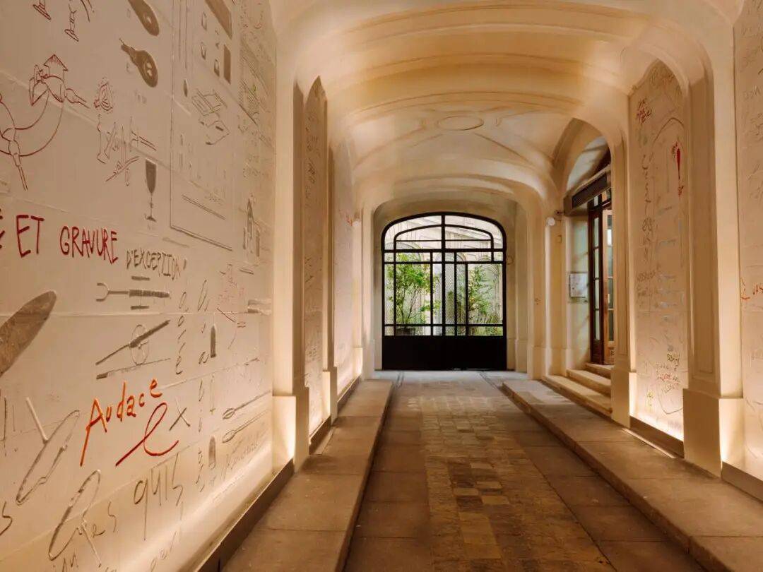 门厅是一段工艺历史的开场,艺术家Harry Nuriev创作的蚀刻壁板以图文并茂的方式讲述玻璃从熔炼到切割的流程。设计师Philippe Nigro则在店铺空间内为庆典打造的“红热之亭”,以透明水晶与24K金粉渐次融化出的“巴卡拉红”这一独特色调为主题,将工厂与炉火的记忆转译为可行走的装置剧场。两者共同把参观者带入一个关于火与光的叙事中。