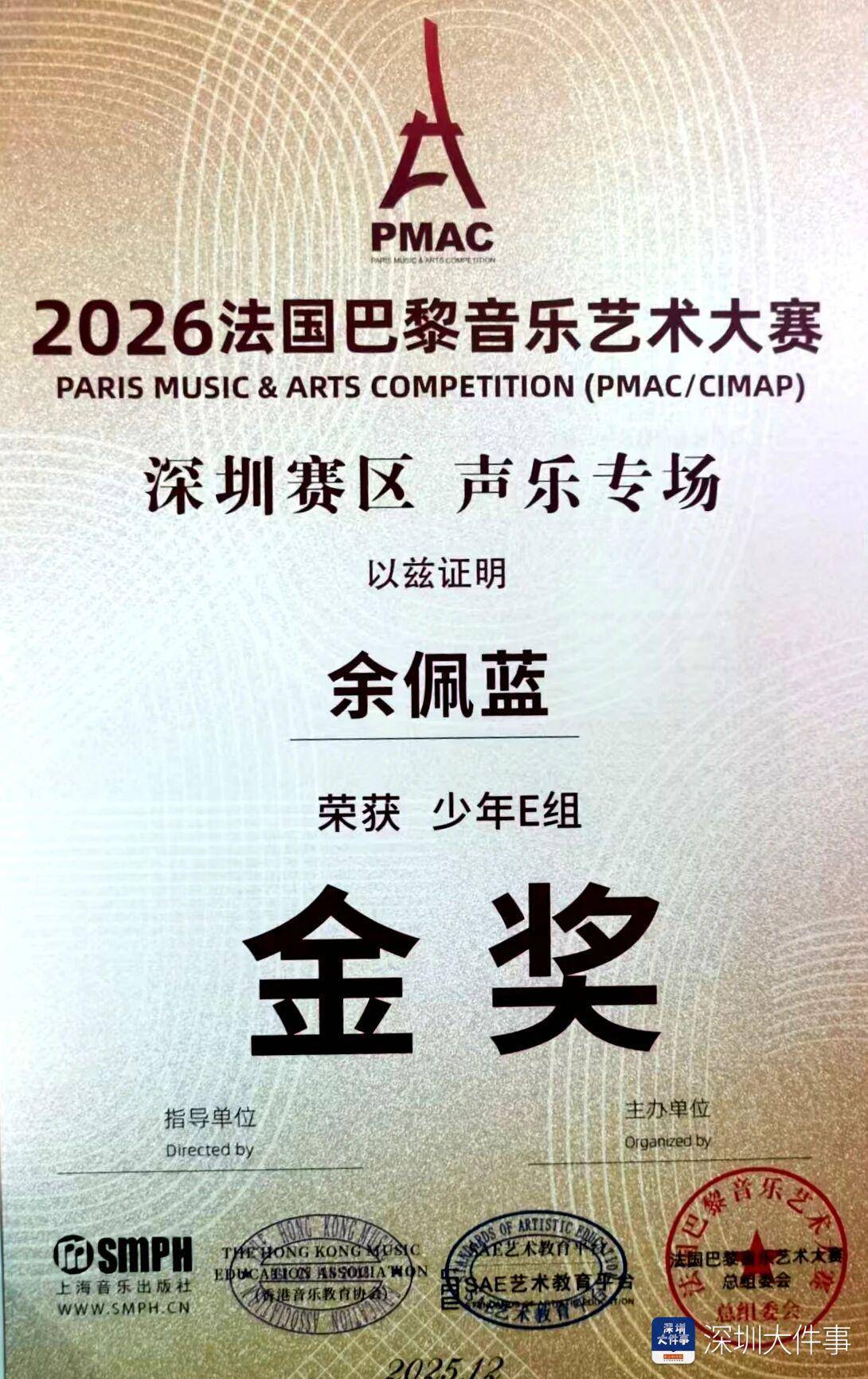 南都讯 记者伍曼娜 近日,2026法国巴黎音乐艺术大赛深圳赛区传出喜讯,深圳市深德高级技工学校学生余佩蓝在声乐专场中荣获少年E组金奖,展现了该校学生在音乐艺术领域的卓越才能和深厚底蕴。