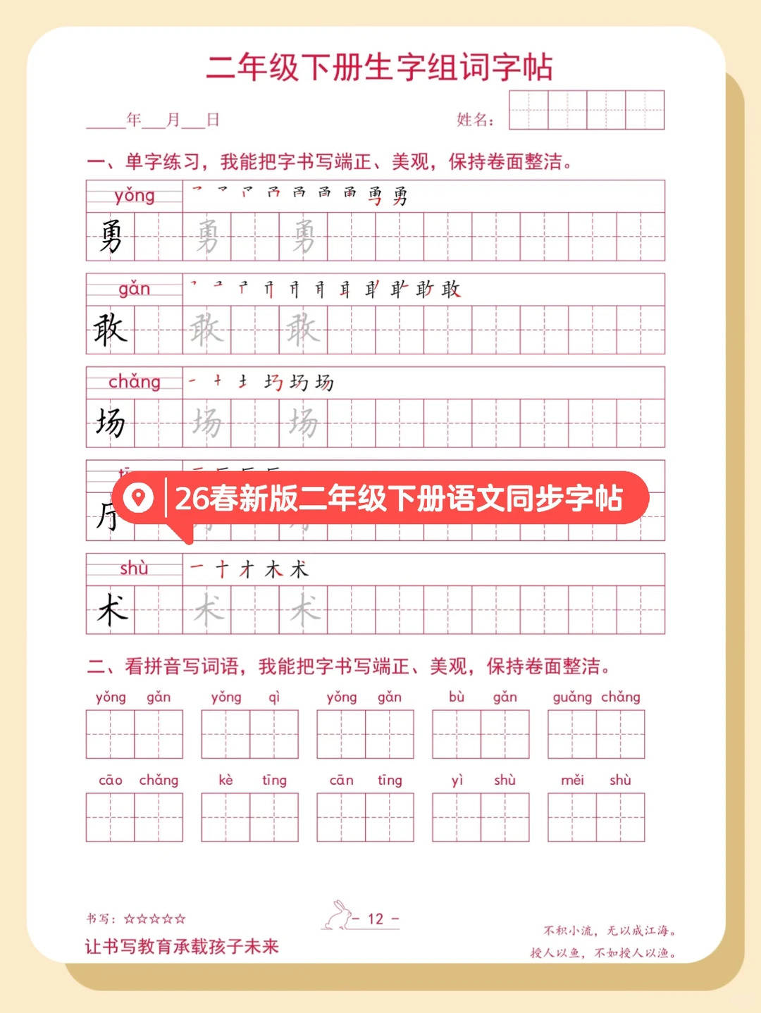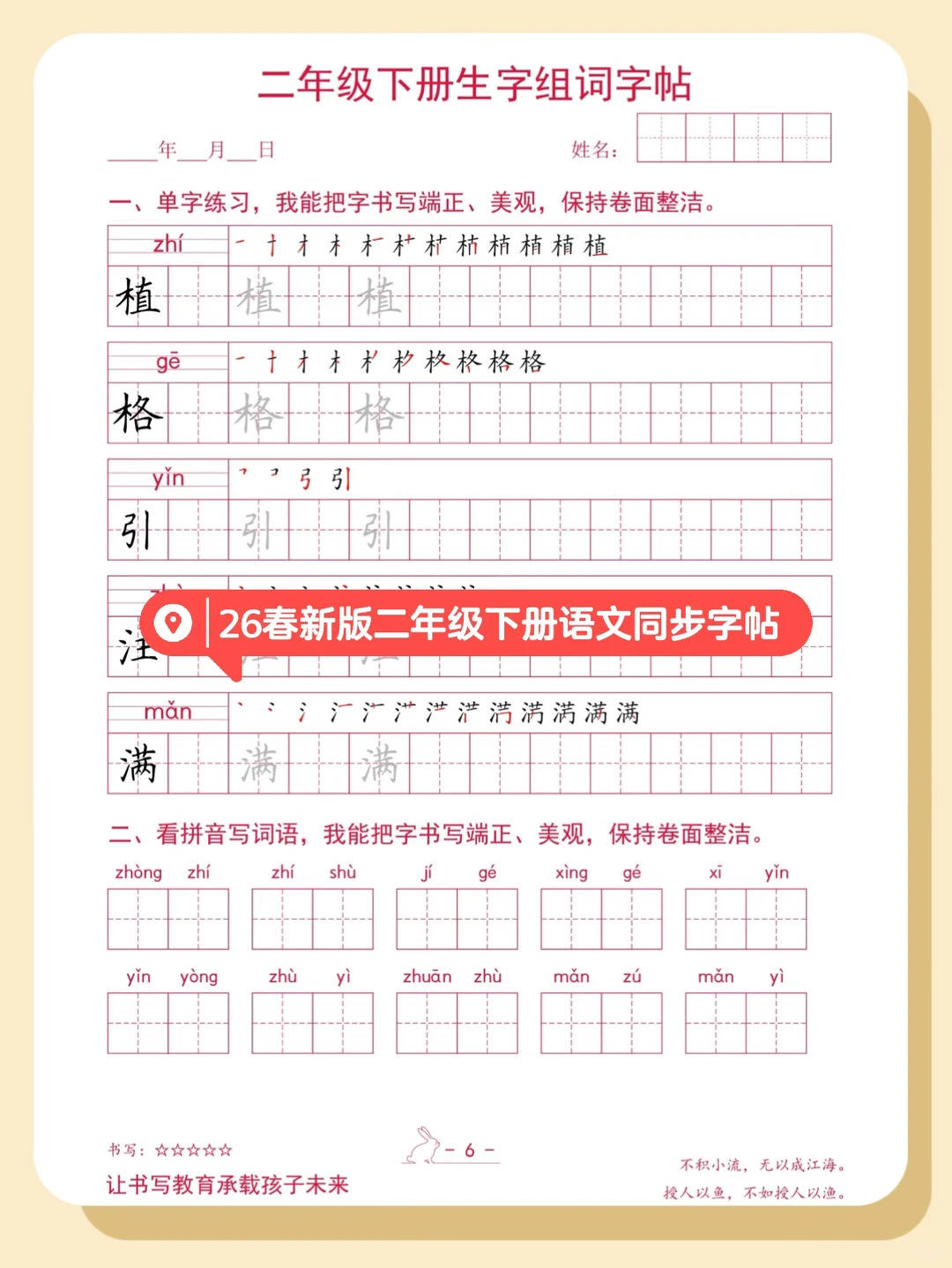 2026 春二年级下册语文同步字帖直接把教材生字做成 **“笔顺 + 书写 + 组词” 的练字通关包 **:从 “诗、碧” 等生字的笔顺拆解,到单字反复练写,再到 “看拼音写词语” 的组词巩固,全程同步课本生字,练字像解锁 “语文书写基础副本”!