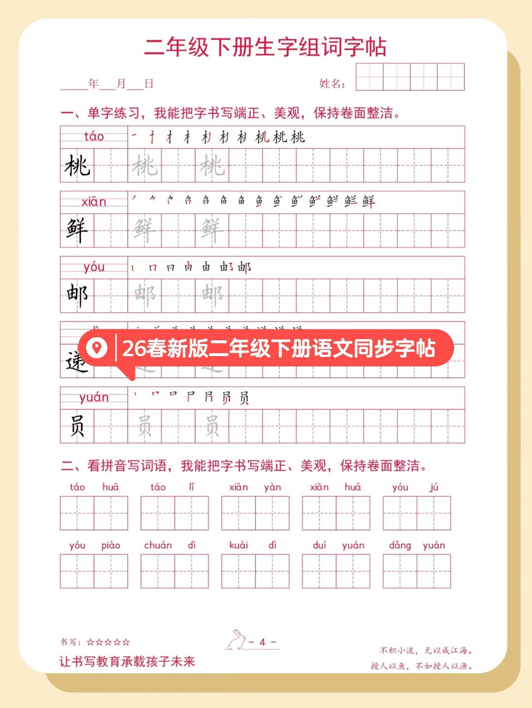 适配二年级 “从识字到规范书写” 的能力升级需求—— 二年级是语文 “首次系统练写字、建立书写规范” 的关键期,易出现 “笔顺错、字写歪、不会组词” 的问题,这份字帖用 “三步训练” 破局:先给出生字笔顺(如 “桃” 的笔画拆解),再让孩子反复练写单字,最后通过 “看拼音写词语” 组词巩固,既贴合 “二年级重书写启蒙” 的节奏,又解决 “书写不规范、字词用不对” 的痛点。其次是设计踩中二年级 “具象驱动 + 循序渐进” 的认知特点—— 二年级娃怕 “练字枯燥、练了没效果”,这份字帖把内容做成 “书写任务链”:用 “田字格 + 笔顺提示” 降低书写难度,用 “单字→词语” 的递进替代机械重复,练字像 “完成汉字书写小游戏”;从 “笔顺拆解” 到 “单字练写” 再到 “词语应用” 的闭环,学起来目标清晰,完全不抵触。