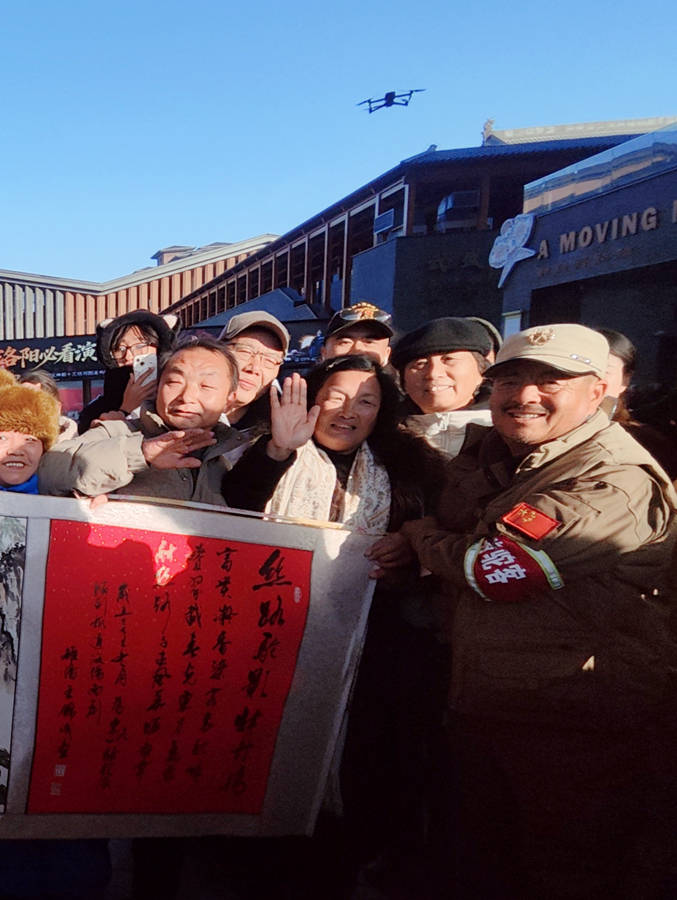 蒋队长说:“这是洛阳人民与哈密两地友谊的见证,更是两地文化交湢的体现,这幅作品将代表两地友谊久收珍藏。” 快门按下,定格下珍贵瞬间:蒋晓亮队长的风尘仆仆与王锦成院长的儒雅谦和相映成景,身后骆驼的剪影与远处定鼎门的轮廓构成一幅流动的丝路画卷。这幅合影不仅是两位践行者的相遇,更是丝路精神的具象传承——
