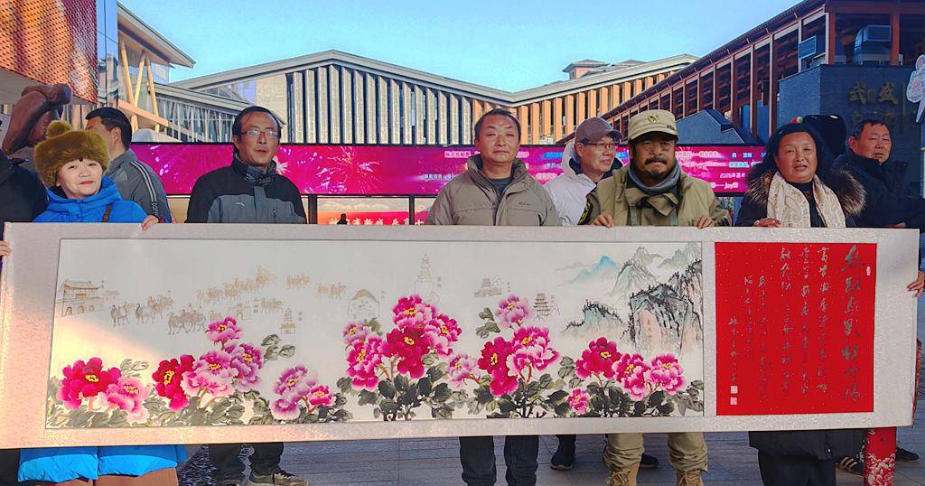 洛阳长城书画院院长王锦成携夫人周奇奇与牛亚丽女士专程带画作拜访骆驼队蒋晓亮队长。两位志同道合者的双手紧紧相握,目光中满是对丝路精神的共鸣。蒋晓亮队长细数征程中的艰辛与感动,从沙漠中的风沙侵袭到沿途民众的热情相助,每一段故事都令人动容;王锦成院长则分享了巨作《丝路驼影牡丹情》的创作初心,这幅作品通过"即使烧焦也不移"风骨牡丹的精神再现代表着对东天山队员的敬畏之心,将骆驼队从东天山启程的壮阔、途经六地的风貌,直至定鼎门入城的盛况一一铺陈,牡丹的雍容华贵与驼影的雄健相映成趣,既再现了古道繁华,更彰显了文明互鉴的永恒主题。