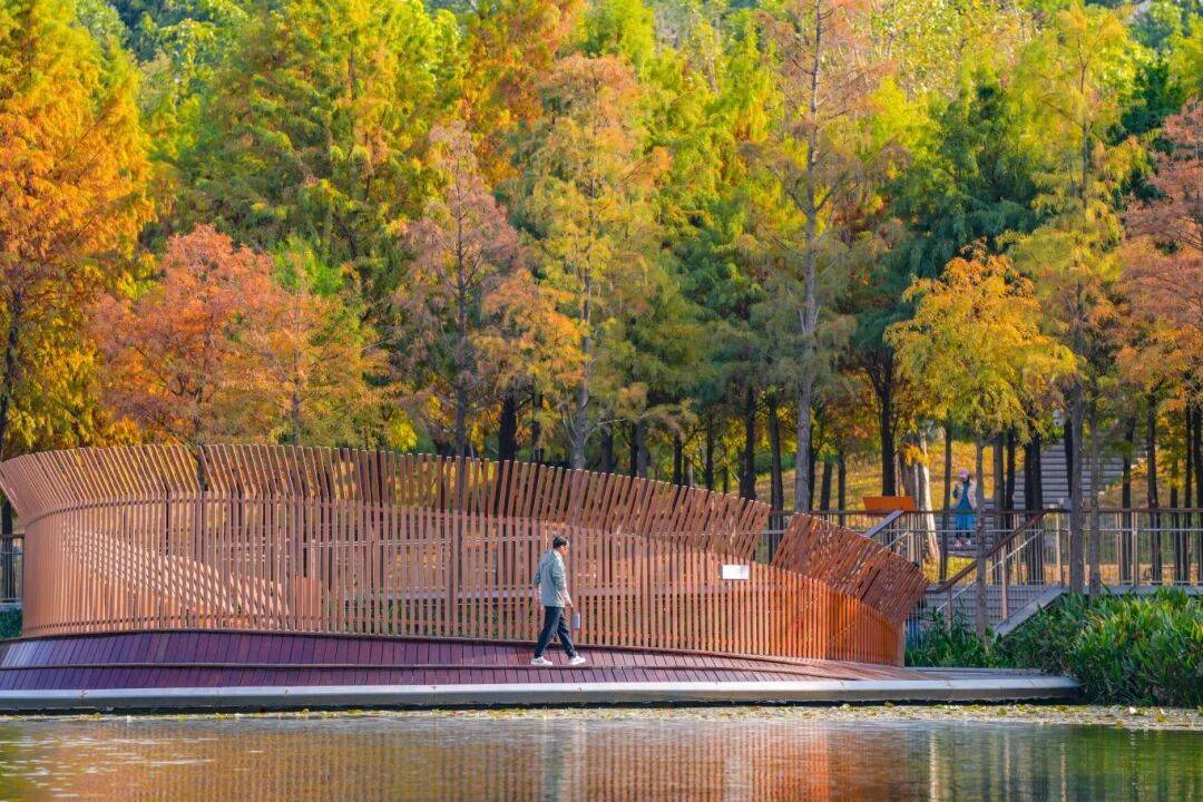 最喜欢的还是沿湖泊生长的落羽杉林。漫步连桥之上,听脚下流水潺潺,眼前是层层晕染的金黄、橘红与深赭,宛如大自然执笔挥洒的油画,置身其中的你也成为了风景。