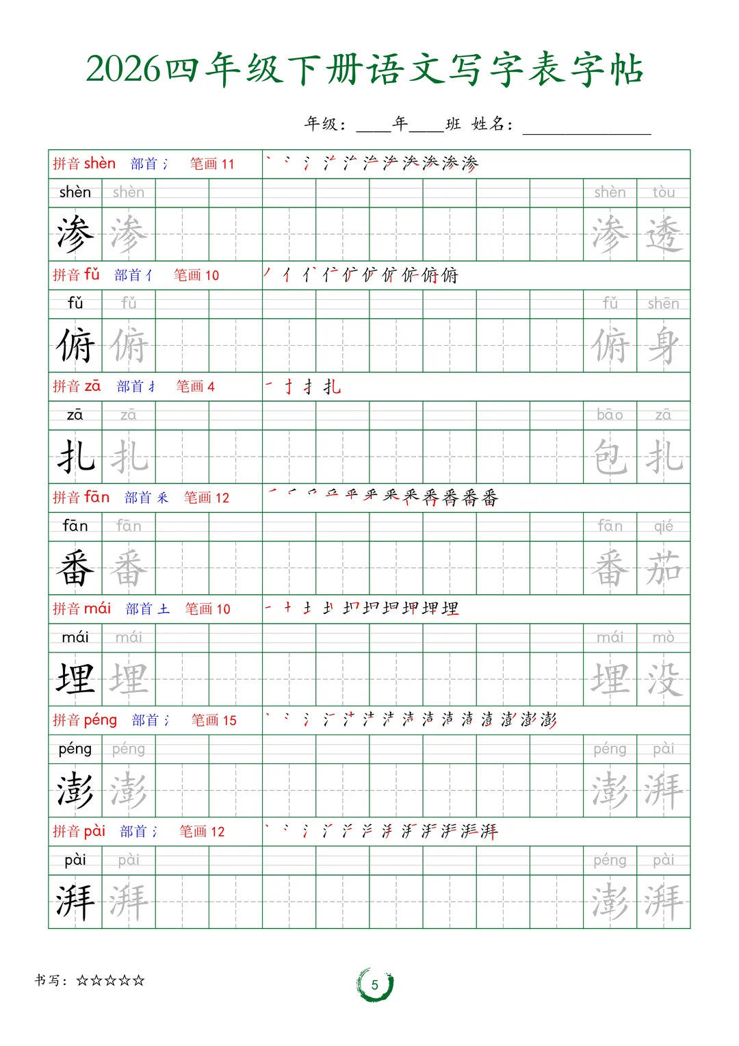 四年级下册语文写字表字帖直接把每课生字打包成 **“笔顺 + 书写 + 组词” 三合一练字卡 **:从 “渗、俯” 的笔顺拆解,到田字格规范书写,连 “渗透、俯身” 的组词都配好,练字像跟着 “生字书写指南” 把课本字写对写好看!