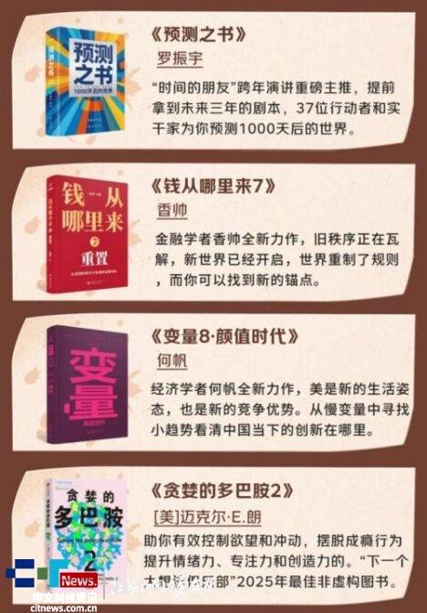 如果你希望在新的一年里洞察时代先机、优化自我认知,那么这四本聚焦趋势与心智的著作值得重点关注。罗振宇“时间的朋友”跨年演讲重磅主推的《预测之书》,集结37位行动者和实干家的前瞻思考,为你预测1000天后的世界。金融学者香帅的年度力作《钱从哪里来7》,深入剖析财富逻辑在新秩序下的演变,帮助读者寻找个人发展的新锚点。经济学者何帆在《变量8·颜值时代》中,敏锐捕捉到“美”已成为新生活姿态与新竞争优势,从慢变量中挖掘小趋势,助力读者看清中国当下的创新方向。《贪婪的多巴胺2》从神经科学角度深度拆解多巴胺与欲望、冲动的关联,帮助读者更有效地管理欲望与冲动,提升情绪掌控力与专注力。