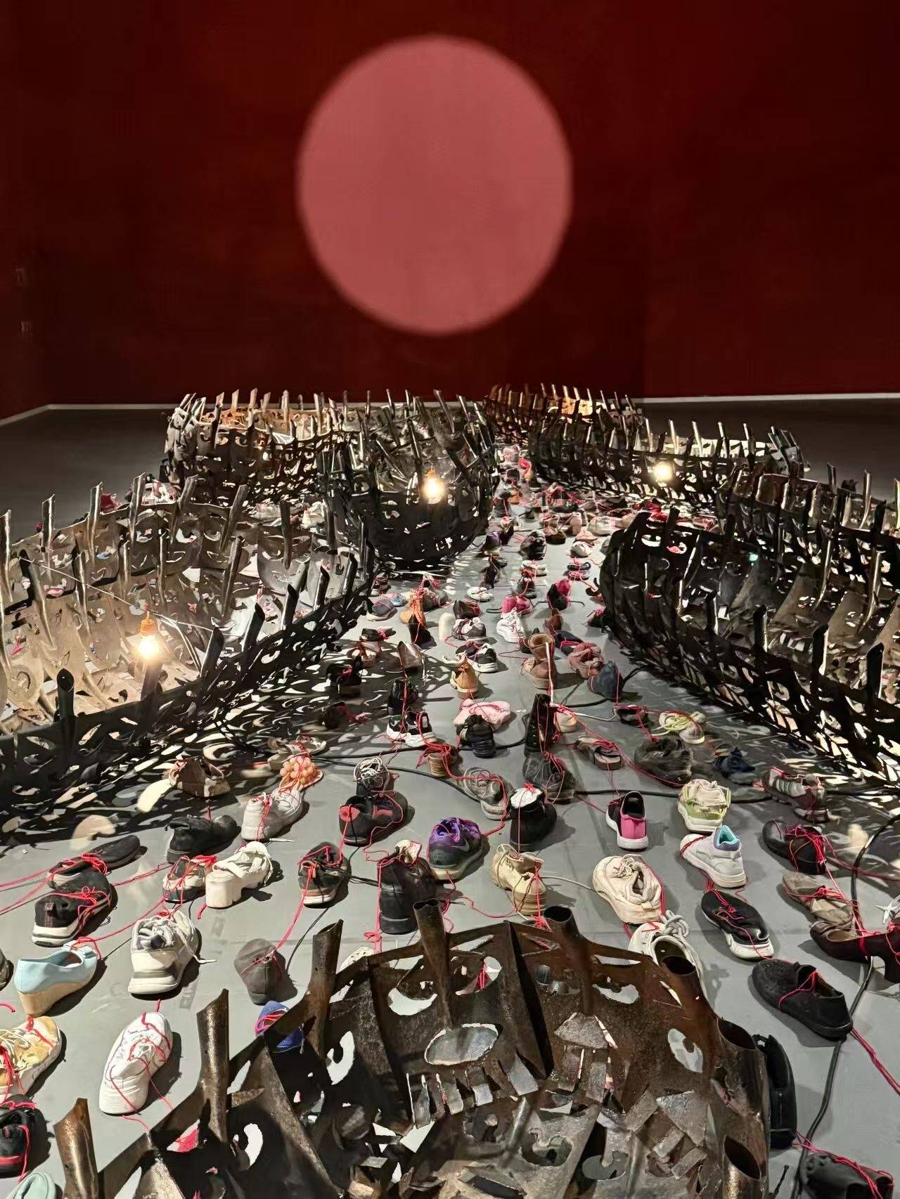 正在天津美术馆展出的“无极・任戎——大型个展”,突然遭遇了争议:装置作品《远方》因被部分网友投诉,导致馆方临时决定撤去该作品大部分组成元素——用红线连接的一双双旧鞋。