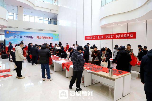 1月10日上午,日照市总工会“送万福 进万家”书法公益活动在市工人文化宫启动。墨香氤氲中,多位来自市书法家协会的书法家们、职工书法达人们现场挥毫,为职工群众书写春联和福字,将新春的祝福凝聚在一笔一画之间,也为即将到来的春节增添了浓厚的传统文化气息。