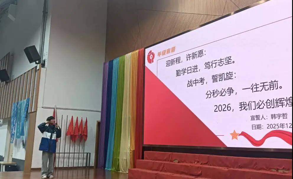 初二年级戚卿轩、魏子涵、刘肖瑶、沈修晟和葛颖颖同学表演了在姑苏区“三话”比赛中获得的一等奖作品《姑苏黎明》。艺术点亮青春,才华铸就梦想。学校表彰了获得“艺彩之星”的同学们。愿同学们都能在艺术的天地里,绽放属于自己的光芒!走过一段旅程,总有一些画面被时光定格,学校表彰了获得“班级定制奖”的同学们。这是专属于每个班级的“独家记忆”与“精神徽章”。在初三的征程中,总有一些同学,以勇气披荆斩棘。学校表彰了获得“勇毅之星”的同学们。愿同学们都能以勇毅为帆,以梦想为桨,驶向成功的彼岸!顾瑾老师作为初三教师代表表达了对初三学子的祝福,希望同学们以昂扬的姿态、坚定的步伐奔向未来。在韩宇哲同学的带领下,全体初三学生集体宣誓:2026,我们必创辉煌!