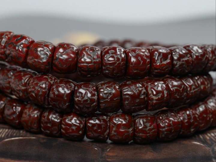 文玩菩提子大部分的品类最后的颜色都是深红色,也就是常说的枣红色,并且年份越长颜色越深、越红!而上油之后的颜色其实也是这种颜色,只是因为油脂充盈这种颜色会更深几个色号罢了!而走色失控的说法其实并不是没有道理,油脂过多会让文玩变色加速,由浅变深的进度也会加快,这便是所谓的“走色失控”,简单说就是“变色的进度停不下来了!”。