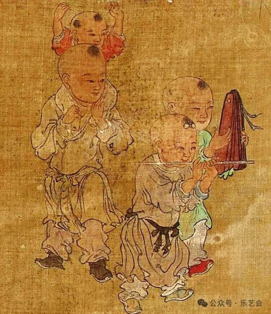 在本画面上,左侧一个童子推着一辆玩具车,车上坐着一个大头娃娃,车前面还有一个童子在拉车。其基本布局类似下图所示,只是下图中车子上的是一个玩偶,大致是蟾宫折桂、状元游街之类。