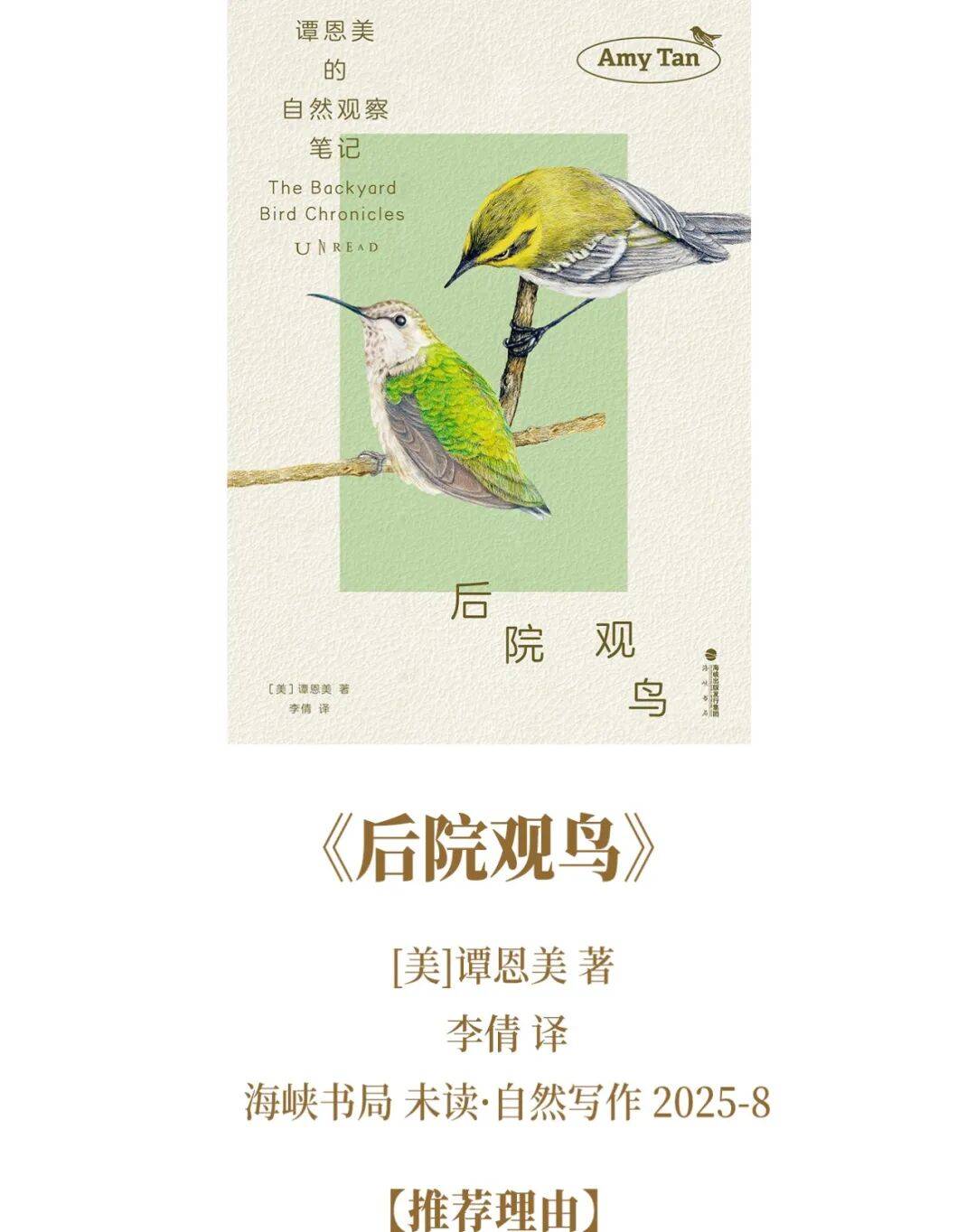 64岁的谭恩美从观察自家后院的鸟儿为始,开启了自己五年的观鸟画鸟之旅。她与孩子们一起上自然课,从零开始学习绘画,在迟暮的年纪重拾孩童般的想象力与好奇心,并将这些心得、思绪与精美的画作都记录在《后院观鸟》这本日记形式的小书里。阅读本书的过程仿佛在重新认识人与自然的关系,鸟儿的生命力从书页间飞入眼前,让人一抬头惊异发现:原来亲近自然不必远赴山海,一扇窗和一颗真诚的心便足矣。