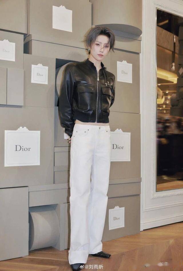 刘雨昕的造型,把 “解构经典” 玩得最明白。她穿的是件不对称剪裁的黑色西装,左边是传统的戗驳领,右边却改成了立领,中间用一枚银色的 Dior 暗扣衔接,没有多余的装饰,却把 “打破常规” 的酷劲藏在剪裁里。内搭是纯白色的高领打底,贴身穿显利落;裤子是微喇的直筒裤,裤脚刚好盖过脚踝,露出一双黑色的短靴,线条干净得像她的舞台动作。背景是纯白色,没有任何道具,就靠一束追光打在她身上,西装的哑光质感和她短发的利落感撞在一起,酷飒里透着高级,完全没把 “优雅” 定义成 “温柔”。