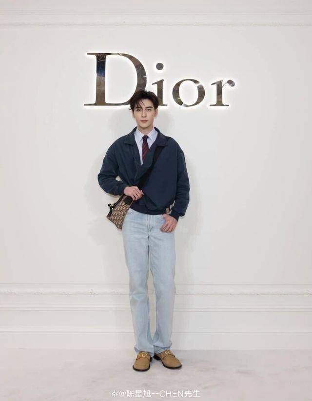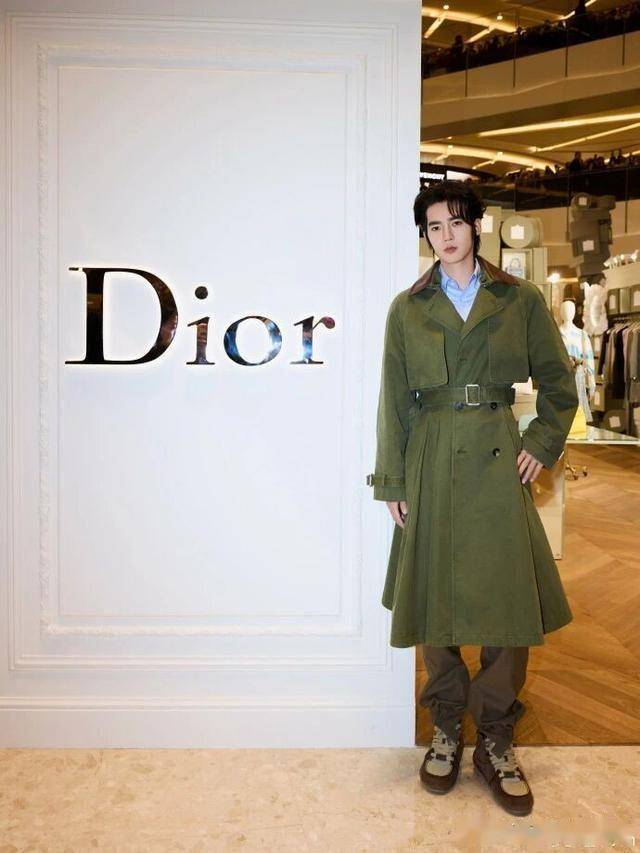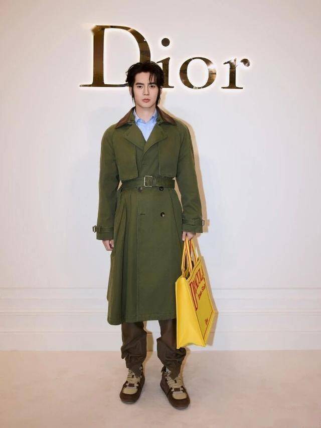 于适还是延续了他的 “暖调潇洒”。这次穿的是浅卡其色的短款夹克,面料是带点粗粝感的棉质,不是光滑的缎面,反而多了点随性。夹克的口袋边缘有细微的 Dior 老花压纹,不凑近看根本发现不了;内搭是浅灰色的针织衫,领口微敞,露出一点锁骨;裤子是微阔的卡其色长裤,垂坠感很好,走路时裤管会轻轻摆动。照片背景里摆了个木质的小架子,上面放着一只迷你的 Dior Book Tote 手袋,暖木色和他的造型色调刚好呼应。光影是暖黄色的,落在他肩膀上,像晒过太阳的温度,还是那个把 “Dior 暖意” 穿在身上的样子。