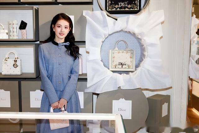 郭宇欣的造型,是 “新人的青涩优雅”。她穿的是浅粉色的纱质连衣裙,面料轻得像雾,上面印着极淡的 Dior 老花暗纹,不是鲜艳的粉色,是揉了点灰调的裸粉,显白又不幼稚。裙子的领口是小方领,缀着三枚小小的珍珠纽扣,没到夸张的程度,刚好点睛;手里拎的是迷你号的 Dior Lady Dior 手袋,浅粉色的漆皮,和裙子颜色呼应,大小刚好适合她的身形。背景是浅紫色的,摆了一小束白色的洋桔梗,光影柔和得像春天的风,她站在那里,没刻意摆姿势,就轻轻提着裙摆,眼里带着点怯生生的亮,倒比 “端着的优雅” 更动人。