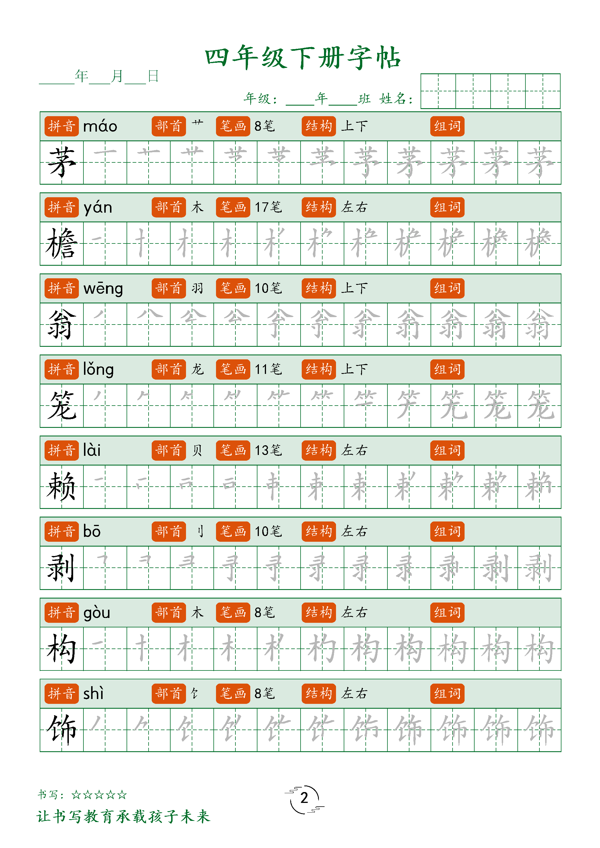 这份字帖精准匹配新版四年级下册语文教材生字表,涵盖所有必学、必会生字,每个生字都标注了拼音、笔顺和常见组词,兼顾练字与积累。字帖字体工整规范,适配低年级学生的书写节奏,孩子跟着练习能快速掌握汉字间架结构。每天花10-15分钟打卡,既能培养专注力,又能提前攻克下学期生字难点,开学后面对生字学习更轻松,书写卷面也能更整洁美观!