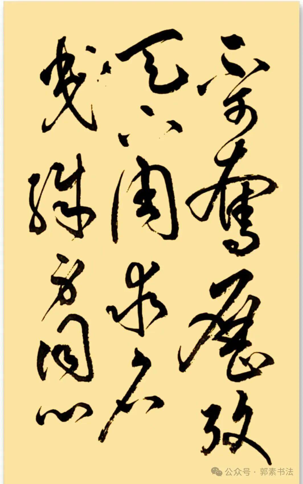 草书一道,郭老主法怀素,得其圆劲流转之妙,复采张旭之颠狂、王铎之恣肆、董其昌之淡逸,熔百家之长于一炉,自成一体。其用笔深得“如锥画沙”,“印印泥”,“折股钗”,“屋漏痕”之精髓,力透纸背,入木三分;其使转具龙蛇飞舞之姿,笔走龙蛇,运动感烈。