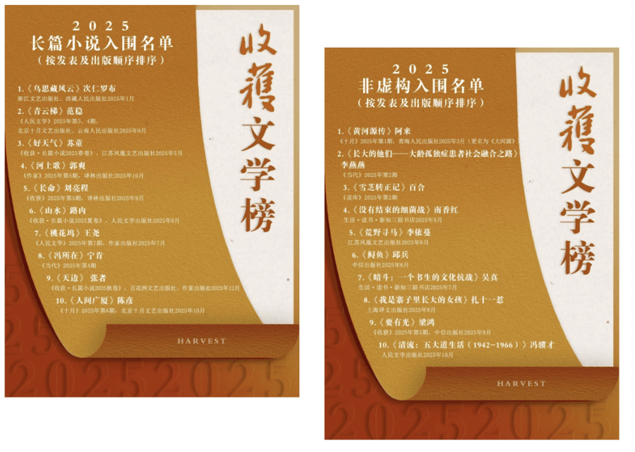 ▷2025收获文学榜入围名单揭晓。入围名单包括短篇小说和中篇小说各15篇、非虚构作品和长篇小说各10部。