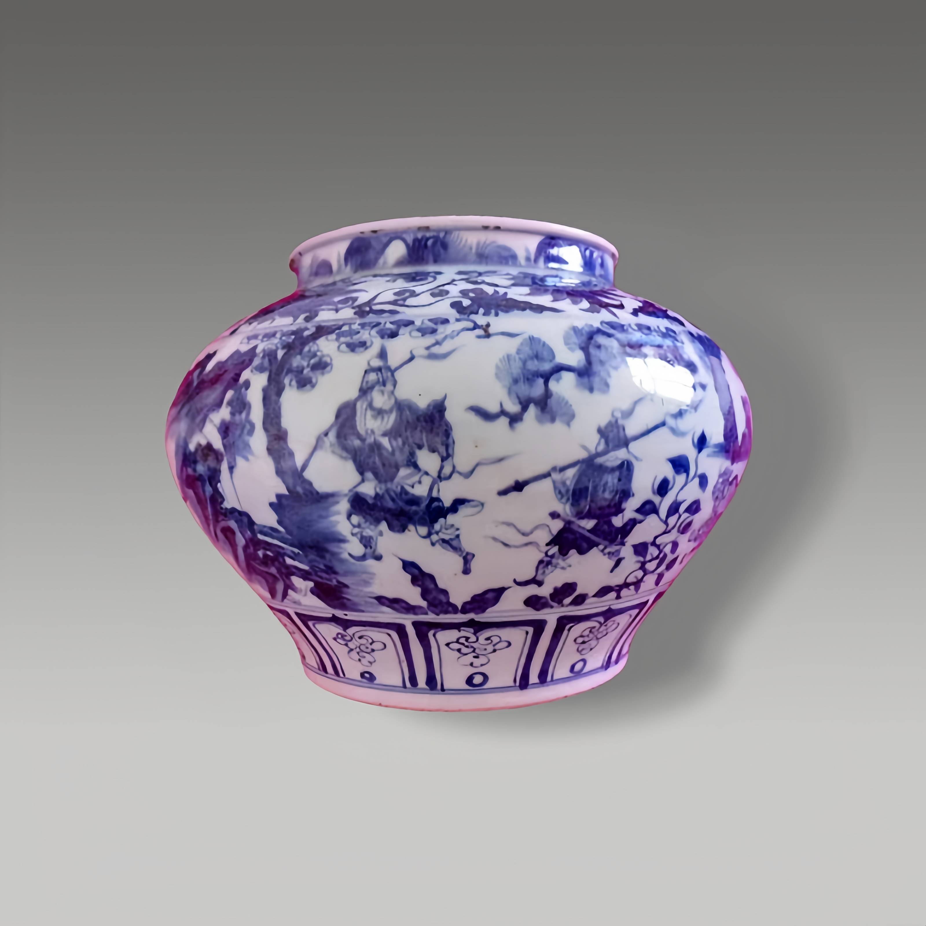 青花瓷罐,以蓝白绘制人物及景物图案,造型古朴,纹饰精美,具较高历史与艺术价值