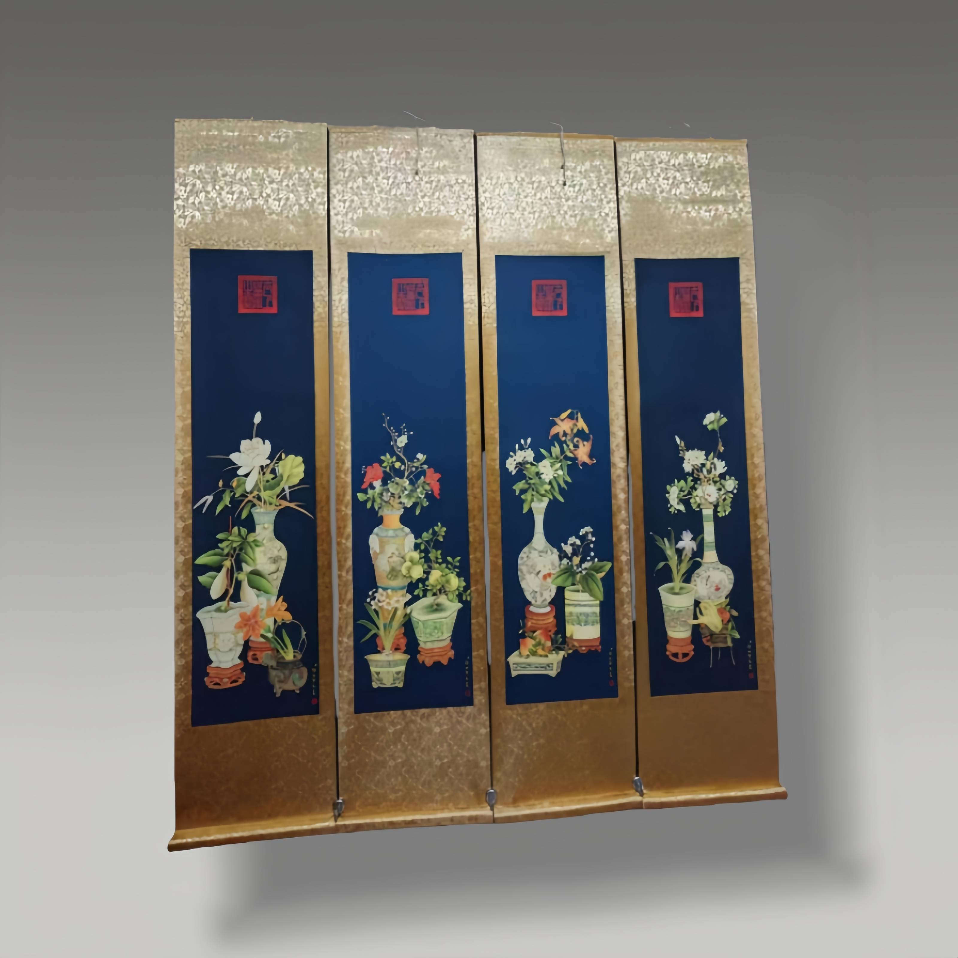 富贵花开四条屏”装饰画,属于装饰画品类,以工笔花鸟/静物风格为蓝本创作
