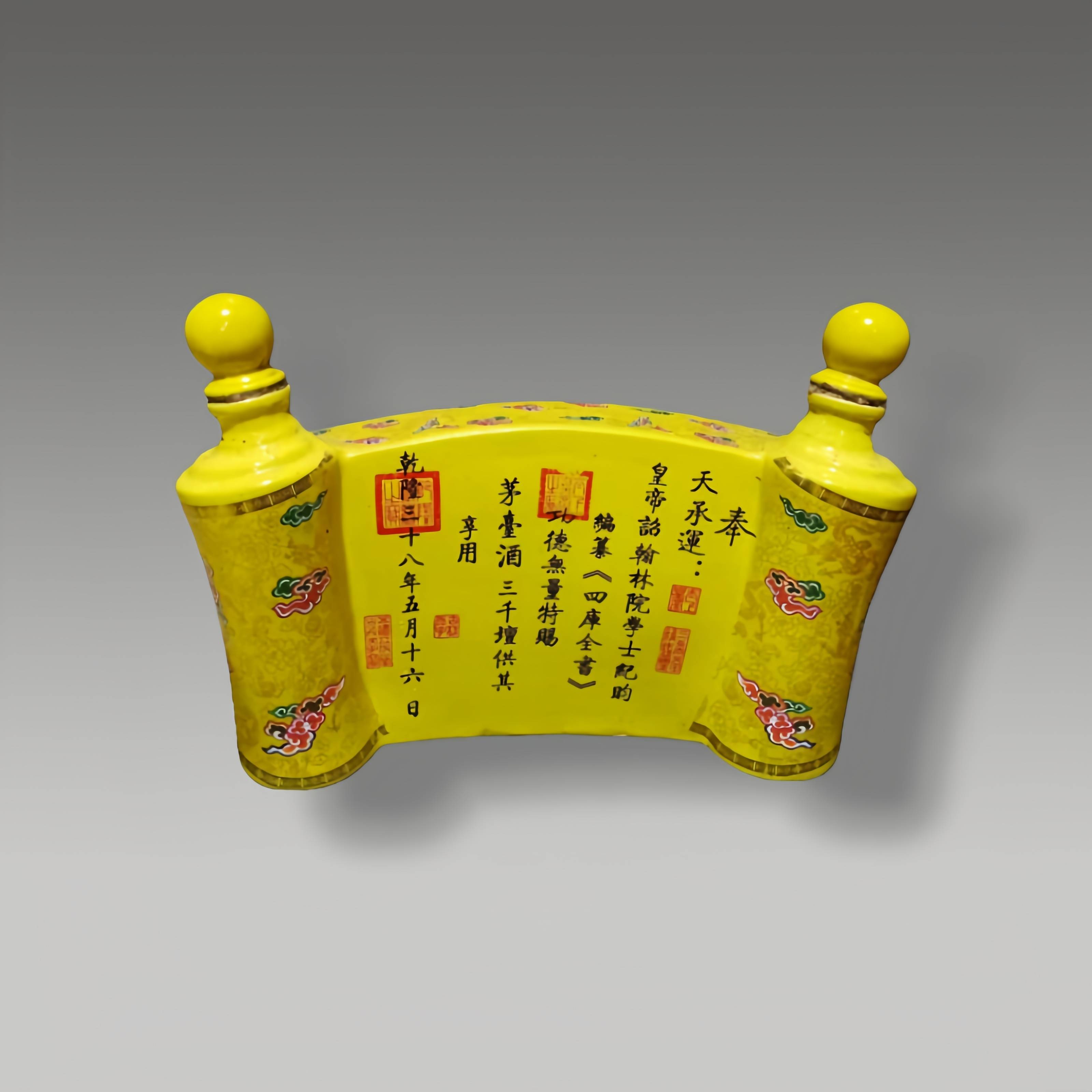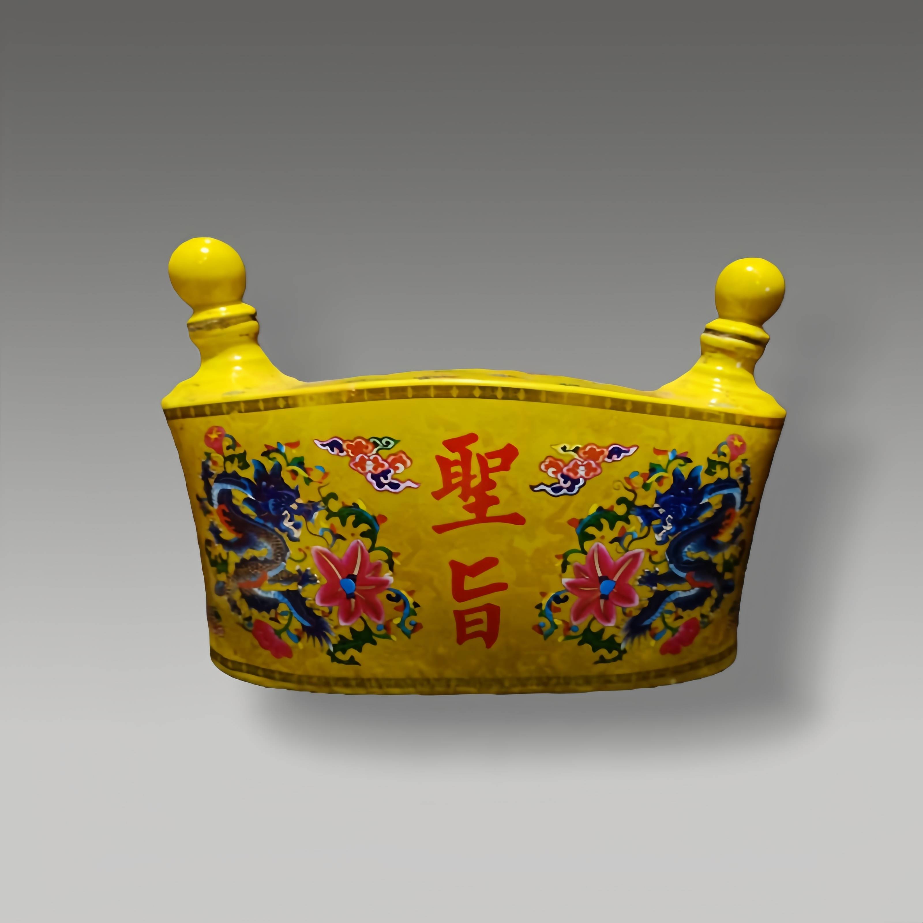 这个物品是一款“圣旨”主题的装饰性容器主色调为明黄色(饰有龙纹、花卉、祥云等传统纹样,风格华丽鲜艳