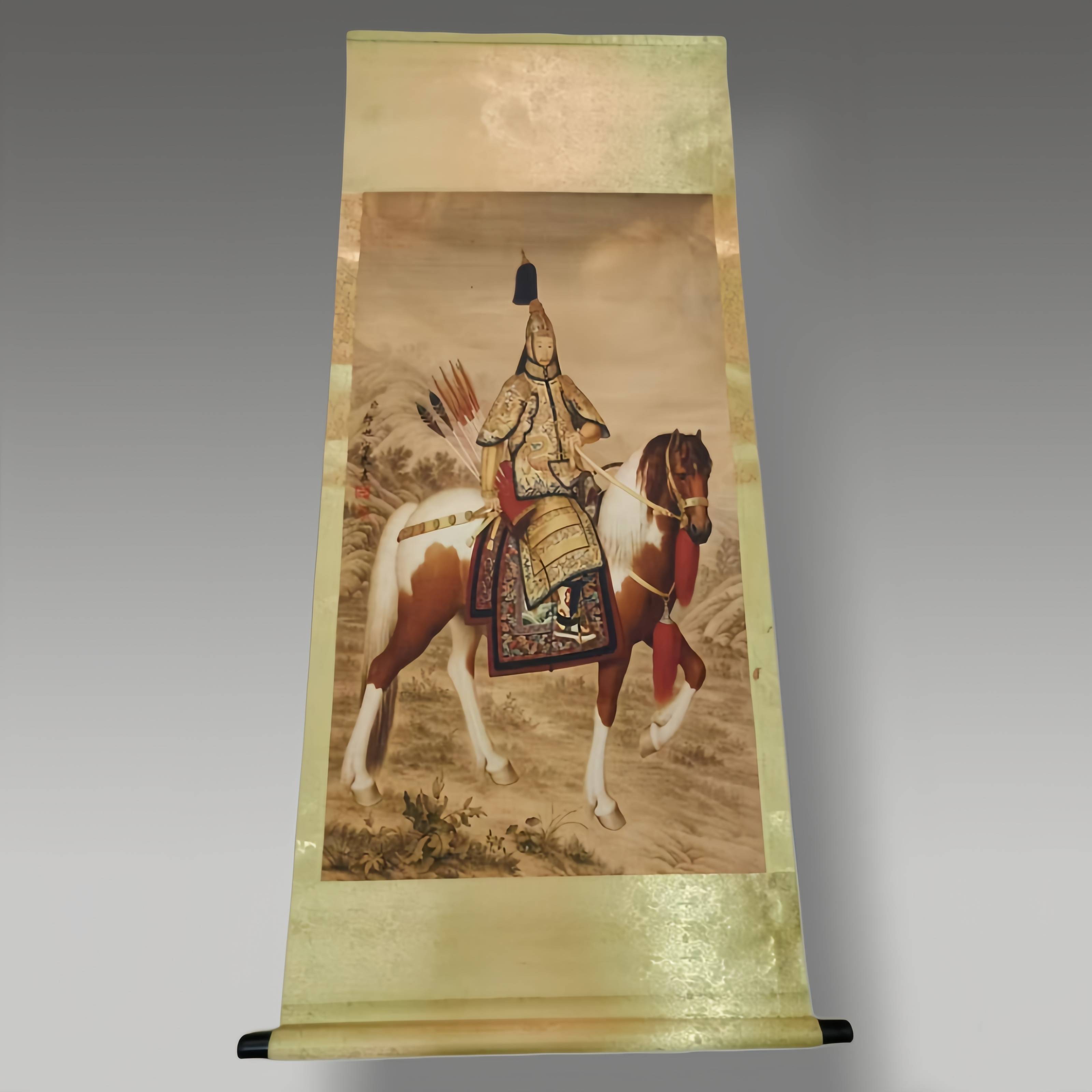 这幅画绘着鎏金戎装、乘花马,工笔细腻显甲胄华彩,配箭矢添勇武气,背景淡染山水,尽显帝王骑猎威仪