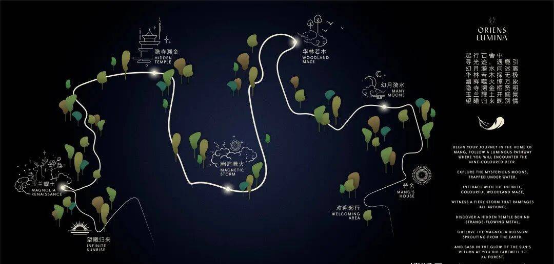 核心亮点:国内首个以“魔杖/光之印章”为互动道具的夜游项目,以“拯救森林”为核心主线,剧情闭环设计,适配全龄客群,融入生态保护理念。