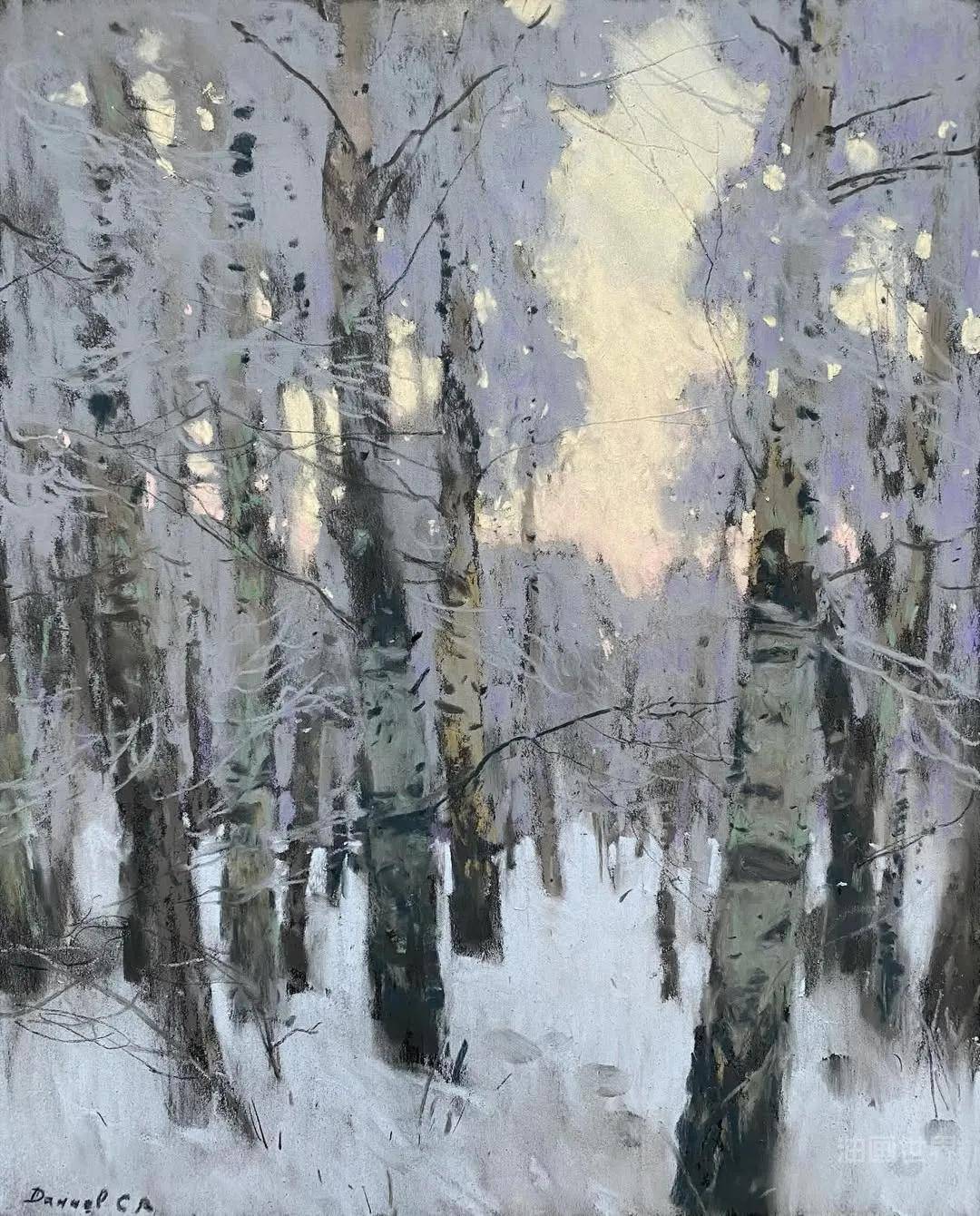 画面里的雪、雾与树干,仿佛在呼吸,呈现出自然与精神的某种共振。尤其在粉彩作品中,更显出其细腻的情绪掌控力与瞬间的抒情特质。