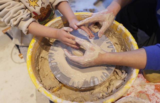 曹明与四岁的女儿一起制作陶艺