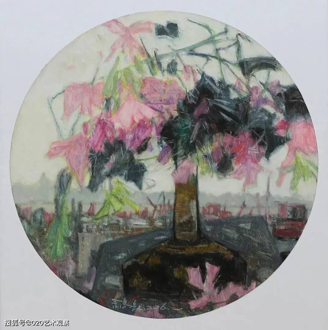 江西师范大学美术学院教师、江西美协理事杨芷的创作聚焦于紫荆花,安利小镇的紫荆花让她联想到香港的紫荆花雕塑,“觉得它是广东、闽南一带的标志性花卉,象征温暖幸福”。她认为,紫荆花与广州经济开发区有着内在联系,“工业是理性的,花是感性的、曲线的,一柔一硬形成对比又相互关联”。杨芷不采用写实手法,而是对紫荆花进行解构、重构,“从色彩和形状上按照自己的意愿创作”。她平时常关注各地特有花卉,画过桃花、荷花,尤其喜欢秋荷,“作为女性,对花有着天然的敏感度,花的色彩与造型自由组合,画起来很舒心”。此外,她还以珠江边窗外景为题材,通过意象表现塔吊、运输船等,“强调笔触的运动感,让画面活起来,而不是死气沉沉地描绘工业设施”。