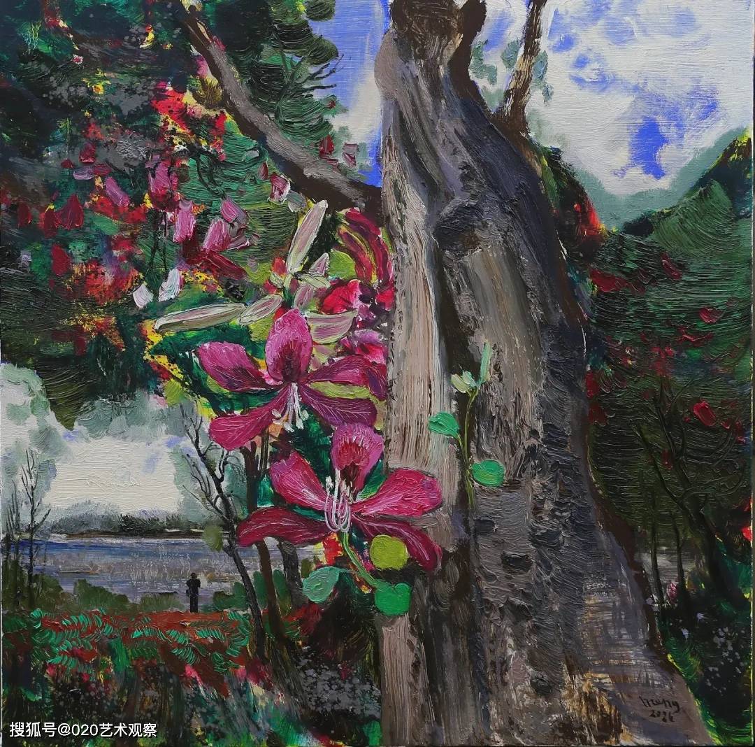 太行·新宇美术馆馆长、商丘市美术家协会名誉主席孟新宇来自中原,工作室在太行山,隆冬时节从冰天雪地的北方来到温暖的广州,东江畔的紫荆花让他眼前一亮。“大片的紫荆花树在北方很少见,透过花丛看到东江的港口、码头和高科技工厂,工业带来的感染力和大自然的感染力一样强烈。”这是他第一次见到真实的紫荆花,而中国香港紫荆花标志的设计者是他的校友,这让他对紫荆花更有感情。“紫荆花在冬季盛开,我用它暗喻工业的美好,以及工业给生活带来的便利。”他平时主要创作表现太行山的油画风景,此次广州之行让他有了强烈的表达欲望,“通过夸张紫荆花、运用广角视角和远景,来表现对这里地域地貌的独特感受”。虽20多年前就来过广州参加画展,但冬季来工业港口码头写生还是第一次,这份新鲜体验让他的作品充满张力。