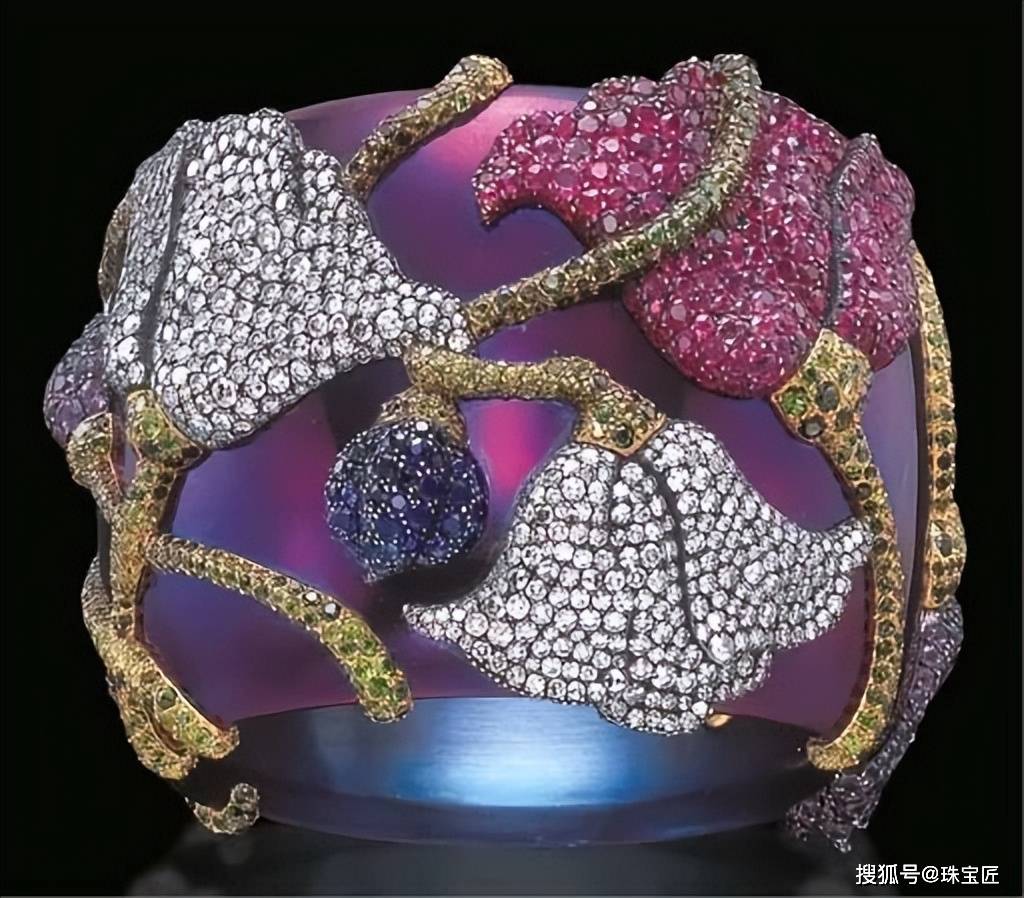 手镯主体以紫色钛金属打造,其上饰满钻石、彩宝镶嵌的立体花蕾,花朵自边缘向内蔓延绽放,不仅体现了JAR设计中独特的生命动感与韵律,也以此向华美繁复的印度传统珠宝艺术致敬。