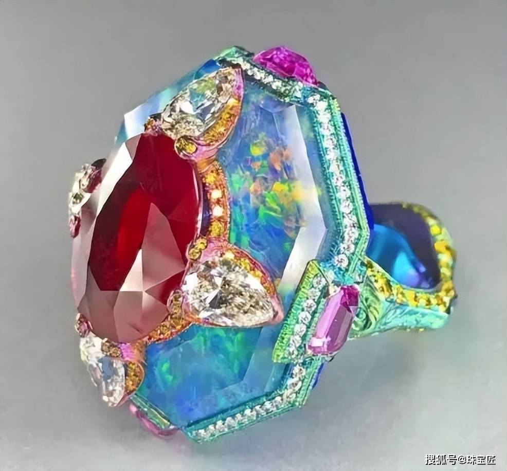 另外一款绣球花戒指,尽管在色彩的丰富程度上不如上面那款斑斓,但两颗巨显眼的星光红宝石和星光蓝宝石与钛金属交相辉映,构造出了闪亮梦幻的视觉效果,瞬间吸引了众人的目光。