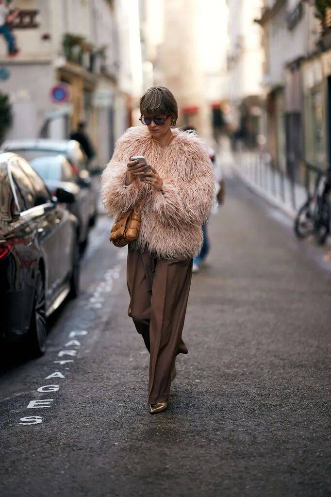 毛绒皮草的材质在低调的柔和气质中,宽松的直筒裤在毛绒的皮草材质上,鲜明的质感也多了直线的利落舒适。