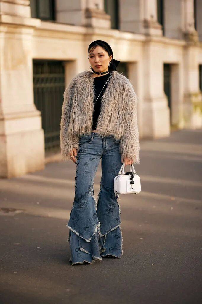 深棕色的皮草外套在和黑色内搭的搭配,休闲层次多了温暖气质,还有浅灰色的牛仔裤多了一些酷飒时尚。