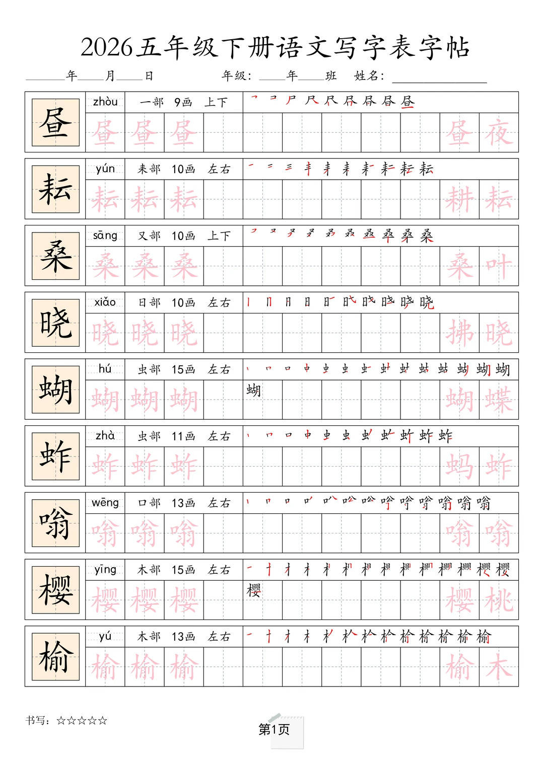 这份 2026 五年级下册语文写字表字帖,直接把全册生字打包成 **“笔顺拆解 + 结构分析 + 组词拓展 + 描红练习” 的全能练字包 **:涵盖 “昼、耘、桑、逗” 等课本核心生字,从笔顺分步拆解、偏旁部首标注,到组词拓展、描红临摹,连 “田字格定位、易错笔画提示” 都安排得明明白白,简直是五年级语文的 “书写进阶神器”!