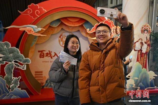 1月11日晚,在合肥大剧院,观众手拿《穆桂英挂帅》演出票根拍照留念。中新社记者 韩苏原 摄