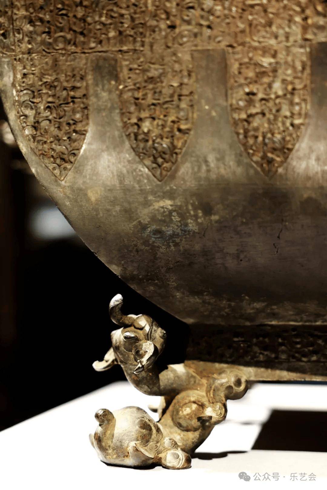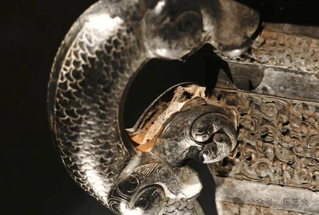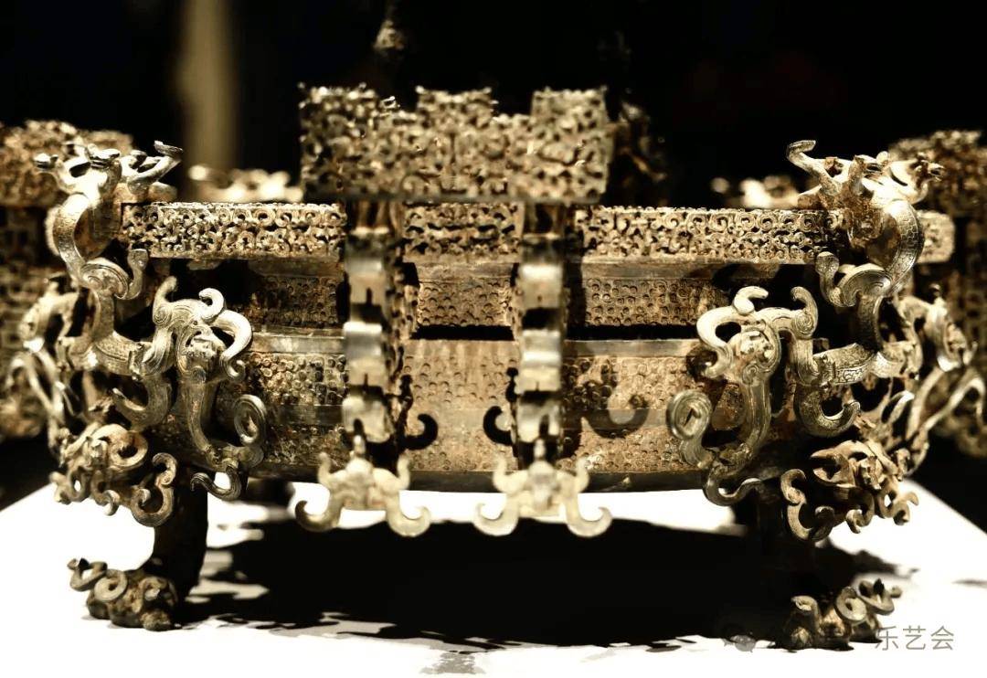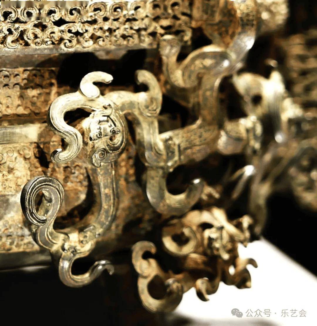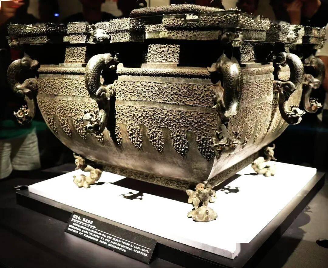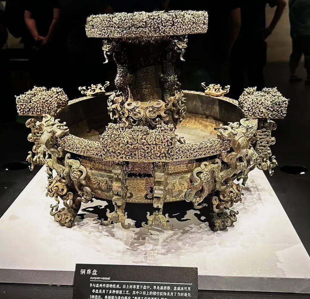 由上尊和下盘组合而成,出土时尊置于盘中。尊的口沿是多层套合的镂空附饰,无数条龙蛇组成镂空花纹,相互盘旋环绕,尊的颈部攀附四只反首吐舌、向上爬行的豹,尊的腹部和圈足满是蟠螭纹和浮雕的龙。