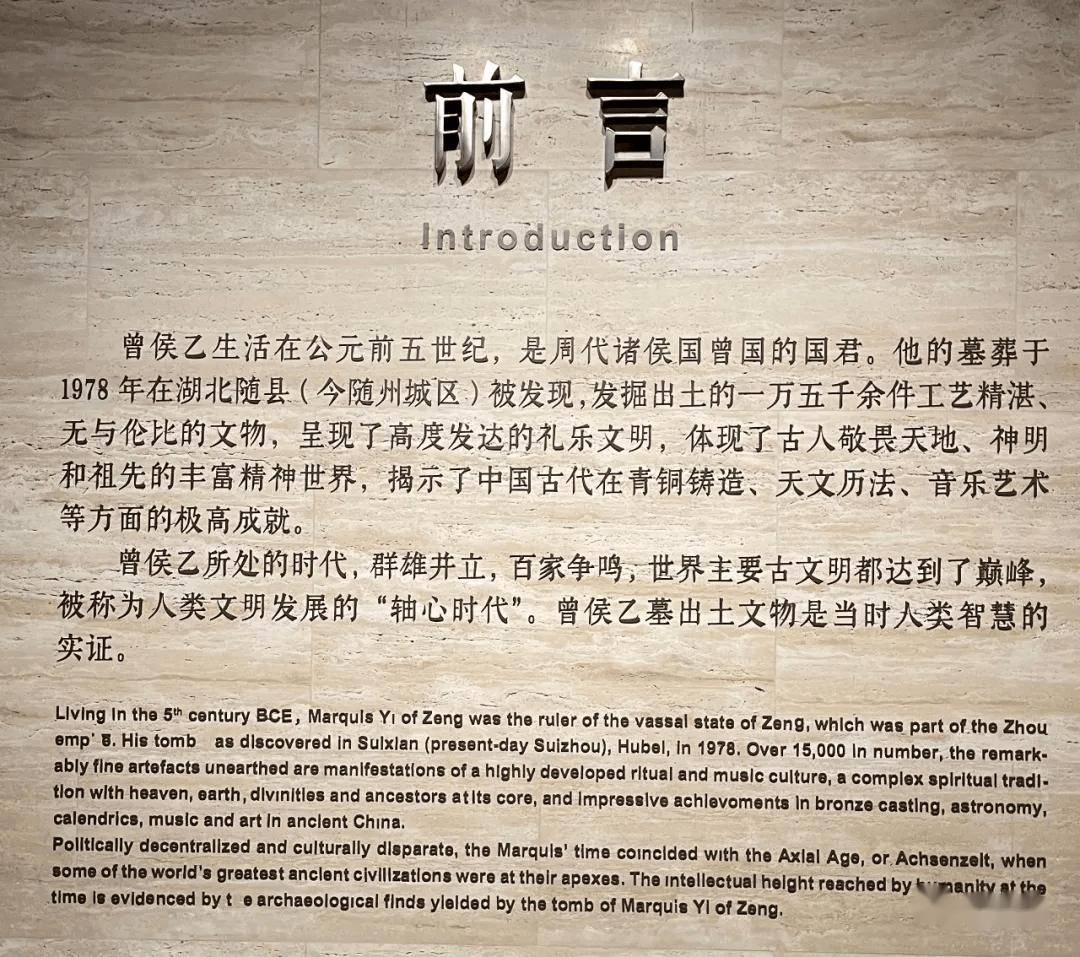 曾侯乙生活在公元前五世纪,是周代诸侯国曾国的国君。他的墓葬于1978年在湖北随县(今随州城区)被发现,发掘出土的一万五千余件精湛的文物,揭示了中国古代青铜铸造、天文历法、音乐艺术等方面的极高成就。 曾侯乙所处的时代,群雄并立,百家争鸣,世界主要古文明都达到了巅峰,被誉为人类文明发展的“轴心时代”。曾侯乙墓出土文物实证了是当时人类智慧所达到的高度。