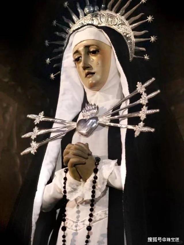 它的设计灵感来自天主教“圣母七苦”与“圣母无玷圣心”的合流象征,七剑是圣母七苦的具象化,红心则是圣母无玷圣心的核心符号,二者结合构成了七剑穿心首饰的完整源头——“忧苦之母”(Our Lady of Sorrows)。
