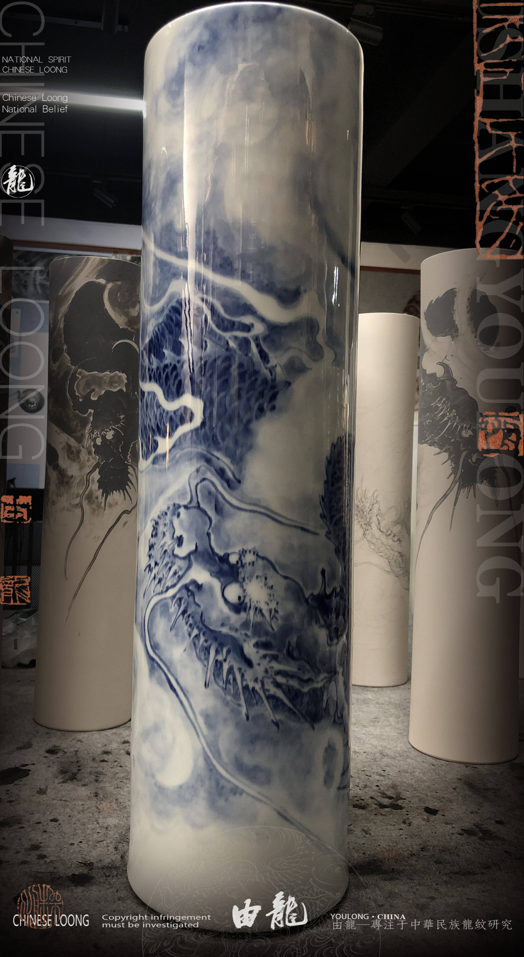 由龙的开拓创新,更体现在对龙文化的当代转译与活化传承。陈容笔下的龙,寄托着古代文人的豪情壮志与治理理想,而由龙则让龙形象与当代精神共鸣——他的《风云际会》系列,以龙的腾跃之势隐喻时代奋进之力;《正龙图》则在传统祥瑞寓意中注入家国情怀,契合了当代人对美好生活的期许。此外,他并未将龙画局限于宣纸之上,而是将其艺术元素拓展至瓷器、铜雕、木雕等工艺品领域,与英雄联盟、汾酒等品牌跨界合作,让千年龙画技法走出象牙塔,融入日常生活。这种“艺术+生活”的传播方式,既延续了陈容以来龙画的文化内核,又赋予其全新的时代生命力,实现了“为往圣继绝学”的艺术追求。