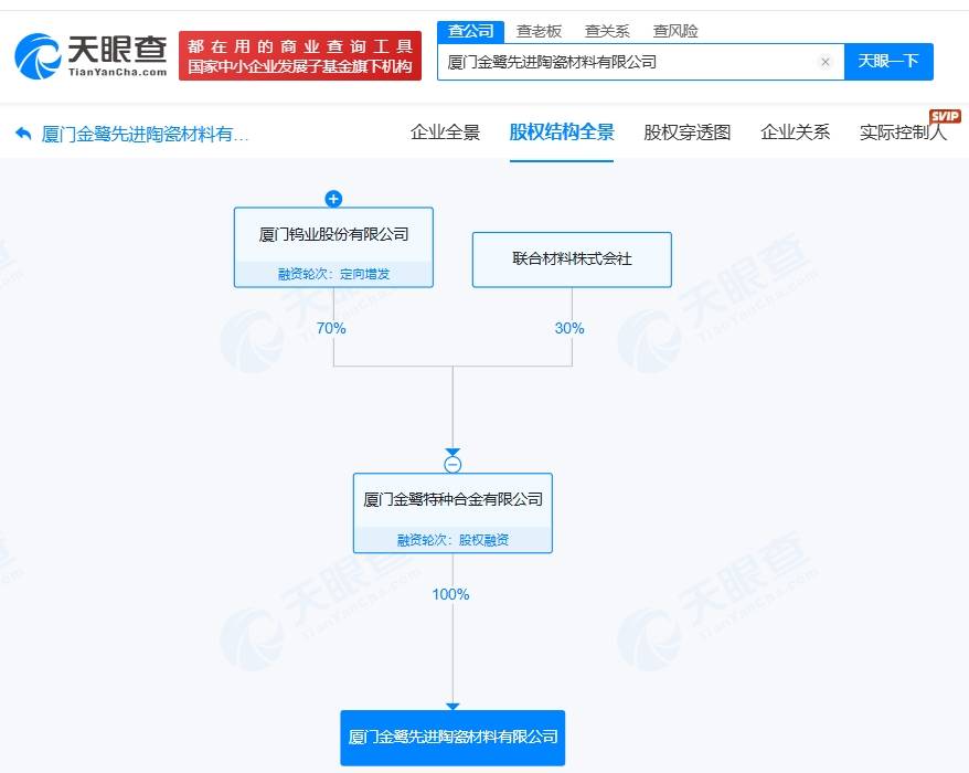 天眼查工商信息显示,1月15日,厦门金鹭先进陶瓷材料有限公司成立,法定代表人为孙东平,注册资本1.9亿人民币,经营范围包括特种陶瓷制品制造、特种陶瓷制品销售、新型陶瓷材料销售、新材料技术研发等。股权全景穿透图显示,该公司由厦门金鹭特种合金有限公司全资持股,后者由厦门钨业(600549)和联合材料株式会社分别持股70%、30%。