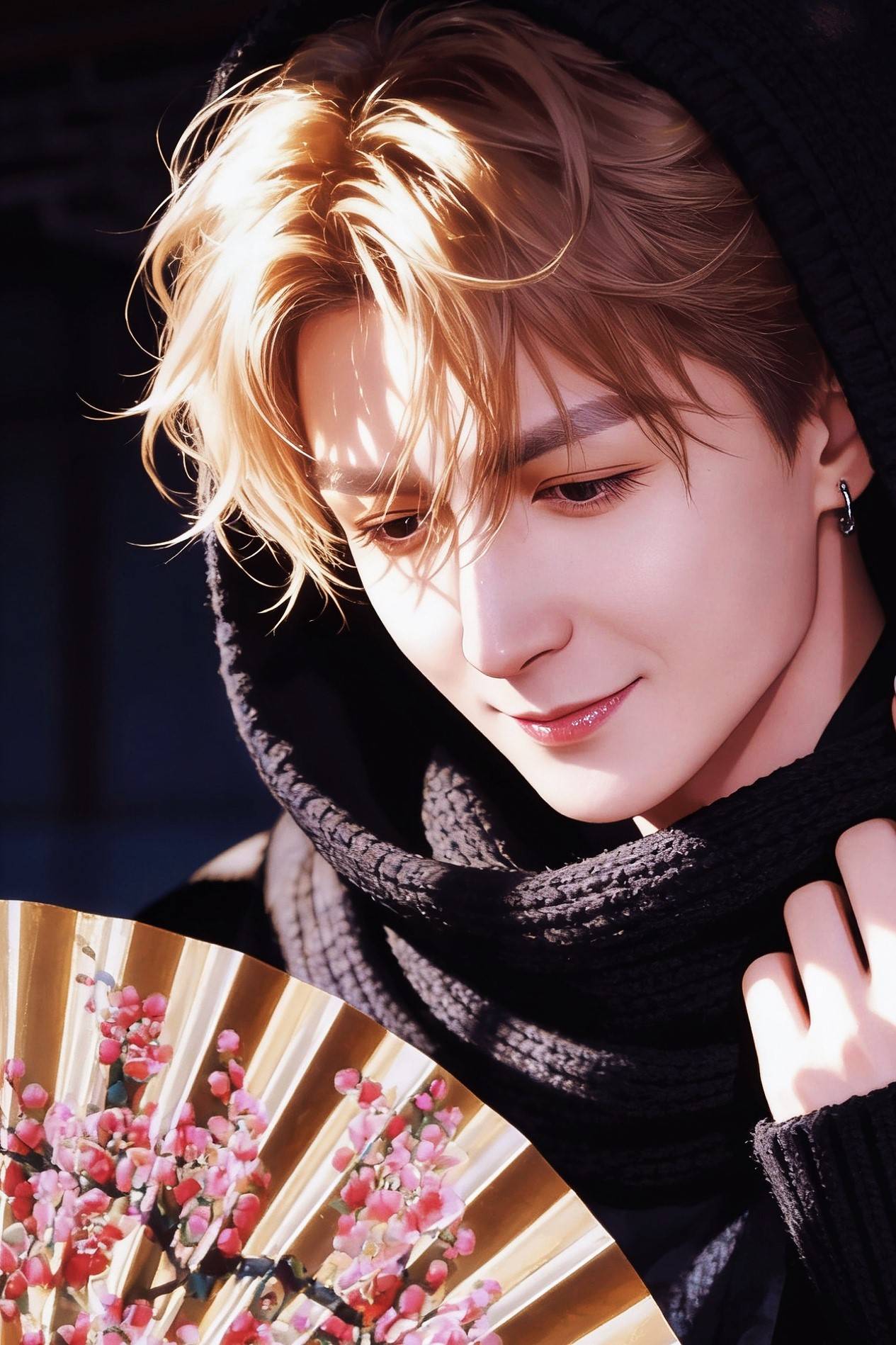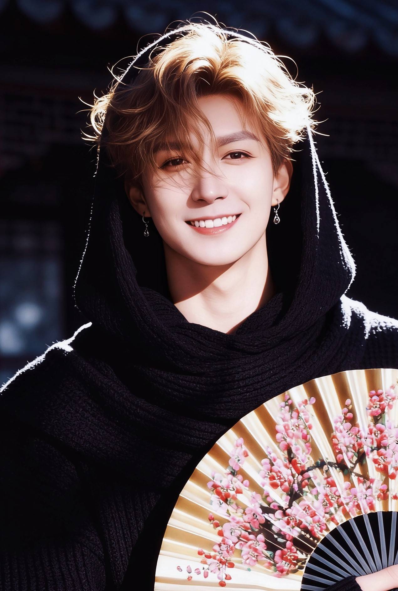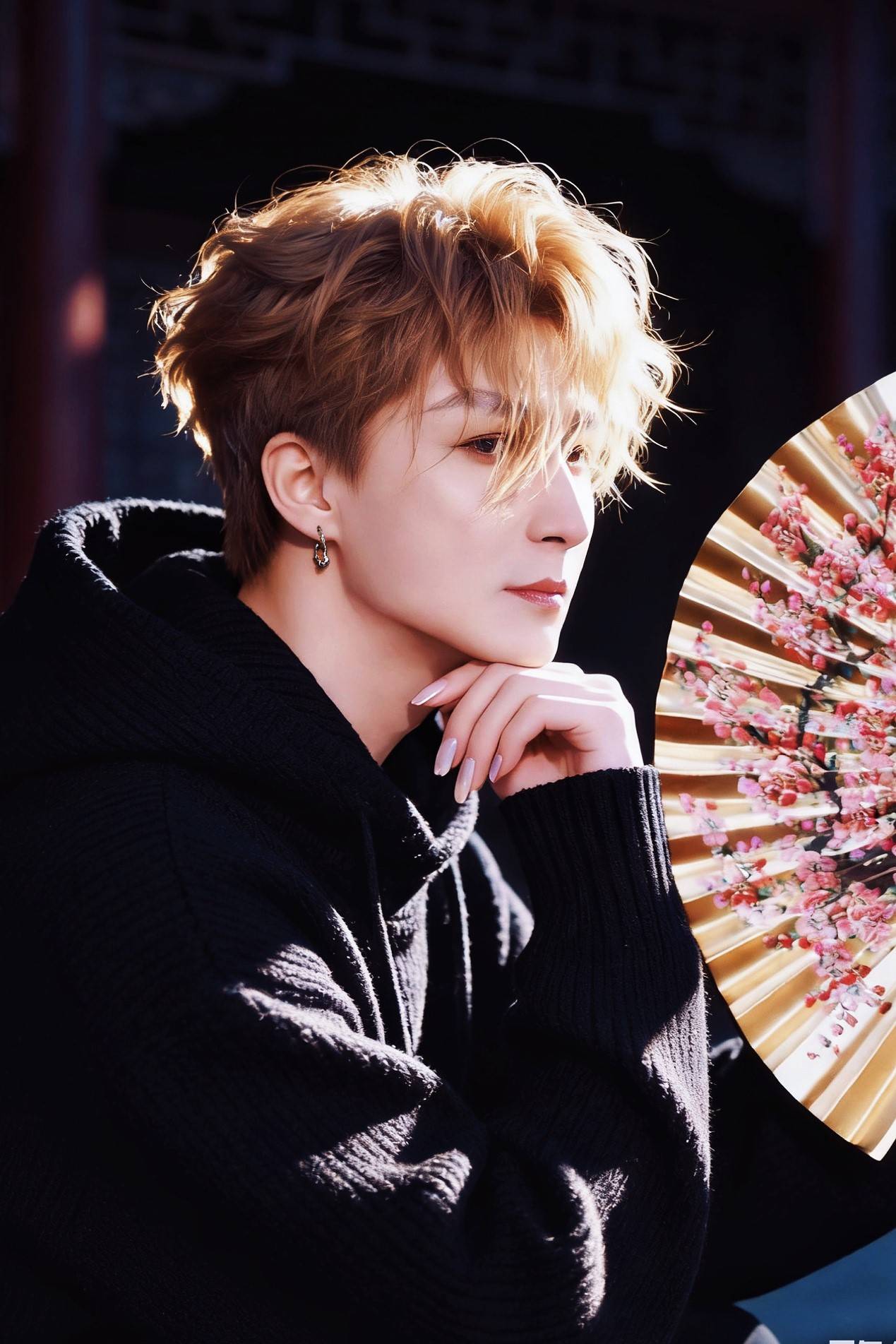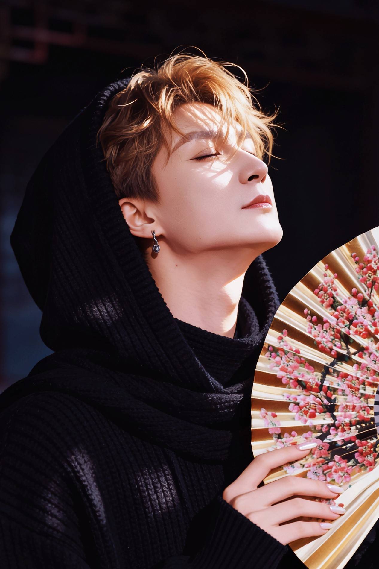 写真以暗调光影为基底,鎏金梅纹折扇作为核心元素贯穿始终,与章磊的造型相得益彰。镜头之中,他身着简约黑衫,蓬松卷发勾勒出利落轮廓,五官如动漫建模般精致立体,眉眼间既有少年的清朗意气,又不失艺人独有的沉稳气场。或执扇而立,扇面轻摇间,鎏金纹路在光影下熠熠生辉,与暗色调背景形成鲜明对比,尽显中式雅致;或抬眸凝望镜头,眼神深邃而富有故事感,将歌手的舞台张力与演员的镜头表现力完美糅合;或侧身而立,身姿挺拔,折扇半掩面庞,于朦胧意境中勾勒出东方少年的独特风骨。