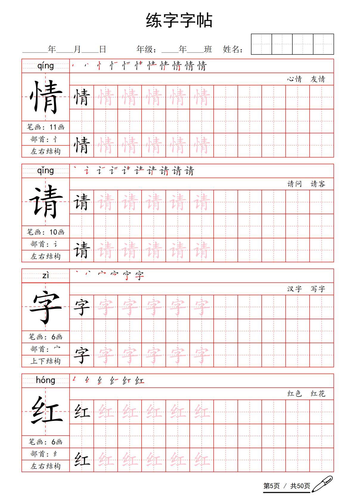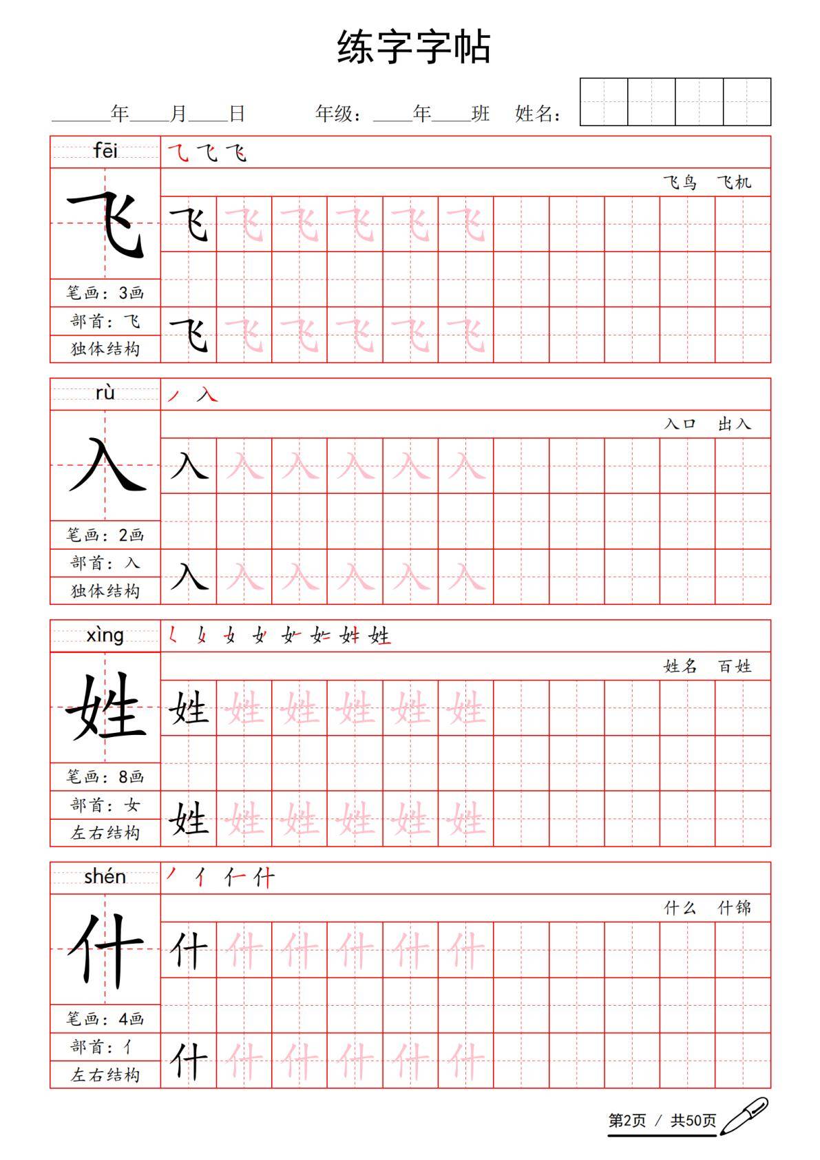 字帖的核心特色在于 “形近字集中突破” 与 “基础字系统巩固”。例如 “青”“清”“晴”“睛”“情”“请” 等形近字集中呈现,通过不同偏旁的对比,帮助学生区分字义与用法;“姓”“什”“么”“古”“言”“国” 等常用基础字则按教材顺序排列,确保学生同步掌握课本生字。此外,字帖对独体字、左右结构、上下结构、全包围结构等不同字形进行分类练习,如 “飞”“入” 为独体字,“吹”“姓” 为左右结构,“春”“花” 为上下结构,“国” 为全包围结构,让学生在书写中建立汉字构字规律的初步认知,提升识字与书写效率。