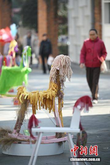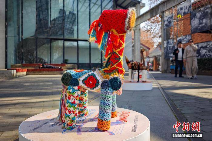 1月15日,江苏南京,市民从造型独特的马年主题艺术作品旁走过。近日,马年主题公共艺术展亮相南京街头,多位艺术家以多彩针织、创意装饰等多元形式对木马进行创作,呈现一件件极富创意与巧思的艺术装置。中新社记者 泱波 摄