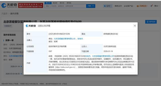 天眼查天眼风险信息显示,近日,北京互联网法院向赵某公告送达原告霸王茶姬关联公司北京茶姬餐饮管理有限公司、创始人张俊杰与其网络侵权责任纠纷案件起诉状副本、开庭传票等,自公告发出之日起经过30日即视为送达,该案将定于3月3日开庭审理。