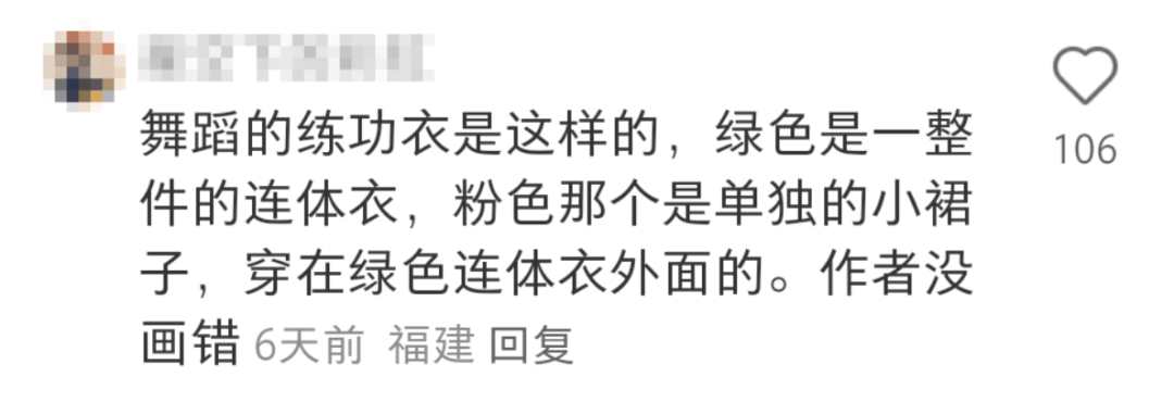 很快,懂行的网友现身科普:舞蹈的练功衣是这样的,绿色是一件的连体衣,粉色那个是单独的小裙子,穿在绿色连体衣外面的。作者没画错。