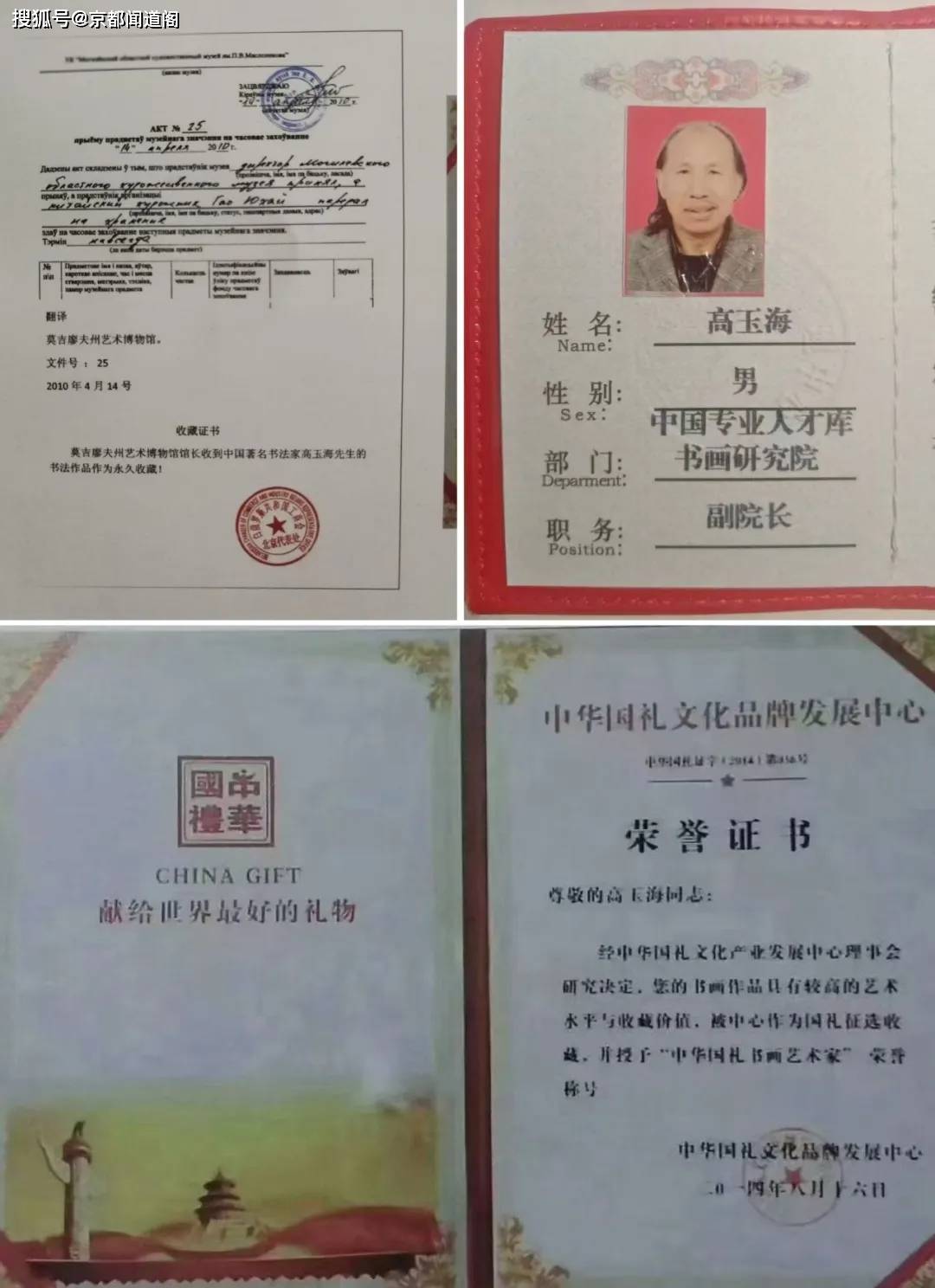 高玉海向笔者介绍,他从2013年以后停止了一切参赛活动集中精力和时间搞创作创新,与时俱进,提出和开创文房五味(笔墨纸砚印)完善我国文房体系。先后提出和开创了五大书风,即汉字书法艺术牌坊书风,原生态书风,多元书风,魔方趣味书风和天地书风。务时务道,开创性提出把伟大的汉字书法艺术打造成为天下第二奇观(第一奇观为宇宙自然)和全人类文化艺术之标志。倡导汉字书法艺术多元化,走继承与探索和创新之路。开创五彩书艺,并获国家数字版权认证。经过多年不懈努力和追求取得可喜成绩。其作品被西柏坡纪念馆,井冈山革命博物馆,珠海市博物馆,比利时皇家历史博物馆,白俄罗斯莫吉廖夫州艺术博物馆,全德华人总会,澳大利亚华人联谊会,上海豫园绮藻堂,贝宁人民共和驻华大使馆,博鳌儒商论坛,军委八一大楼,国务院台办,日本前首相村山富市和鸠山由纪夫,菲律宾副总统敏乃,布干维尔共和国总统依斯迈先生,原军委副主席张万年,巴巴多斯前总理桑迪福德爵士,台协会会长江丙坤,台湾前领导人萧万长,澳大利亚国家文化产业协会主席杨志唯,33届客家大会主席曾观涛,澳门特首崔世安,世界华人协会会长程万琦,美国CEO俱乐部漫库索,美国啥佛大学杰岀教授肯尼迪政府学院院长,软实力理论之父约瑟夫奈,美国科学院院士肯达尔霍克,美国金伯利农场主金伯利,美国华尔街骑士集团总裁陈迅勇,中国驻英国领事馆,美国华盛顿州州长,维也那爱乐乐团,吉隆坡社会福利慈善协会,联合国全球中小企业联盟主席卡洛斯,香港著名导演唐季礼,香港金融元老林广兆,大韩民国国会议员三朝元老金东周,德国生态艺术大师沙宾卡果,希腊马拉松市市长扎哈理斯,台湾大师范光陵,伊拉克利奥市市长尼克斯坂巴罗斯,加拿大多伦多大学,肯尼亚副总统卡隆佐,南美洲第二大收藏世家,苏丹,阿曼等单位或个人收藏。
